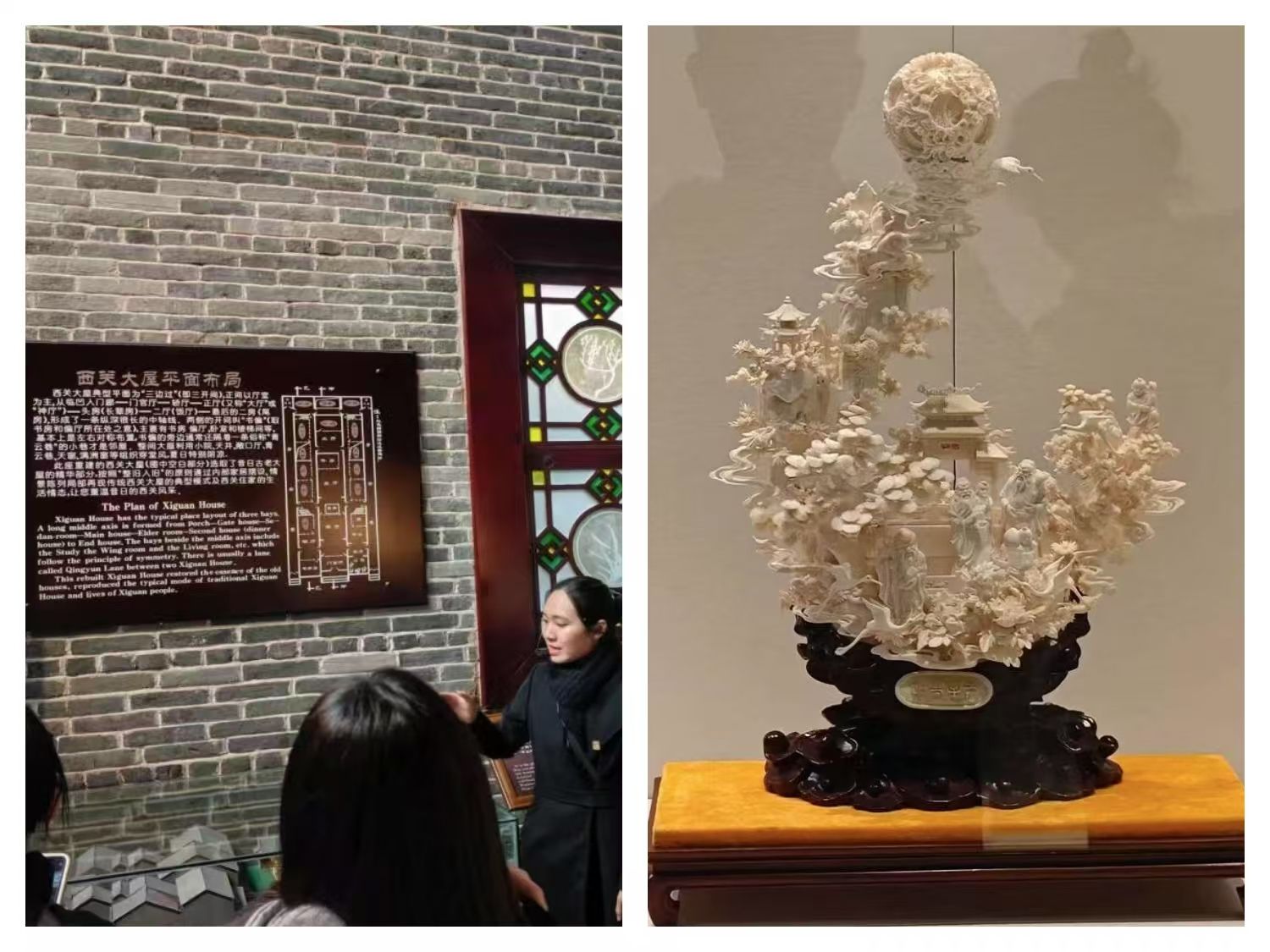 在讲解员吴欣欣老师带领下,师生们开启了参观之旅。走进西关大屋,大家看到了以梅兰竹菊为主题的满洲窗,还听了大理石挂屏“平山积雪”和阮元的故事,认识了三重门的功能和设计理念。天井地漏设计成铜钱样式,体现了广东人的财富观念。二楼的天窗和广府俗语有关,西关小姐闺房则展现了中西融合的风格。最后在馆藏精品展,同学们欣赏到“三雕一彩一绣”作品,仿佛穿越时空领略非遗魅力。