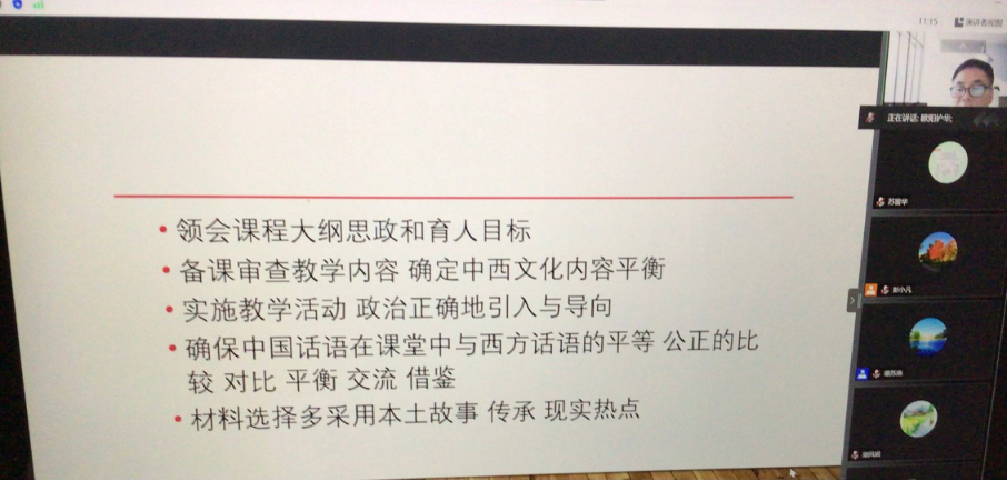 欧阳教授从国际新形势、国内新时代和英语新使命三个方面介绍了课程思政教育方针提出的背景,引导老师们深刻领会课程大纲中的思政和育人目标,确保教学内容的中西平衡,将课程思政融入到课堂教学活动当中,并在评估标准中加入符合文化自信、洋为中用等激励机制。