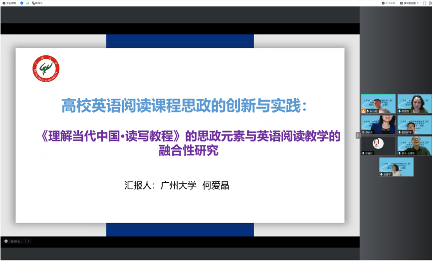 第三个论证的项目是2023年度广州市高等教育教学研究和改革重点项目,何爱晶教授主持的“高校英语阅读课程思政的创新与实践:《理解当代中国•读写教程》的思政元素与英语阅读教学的融合性研究”,专家们根据何教授的汇报,也提出了不少宝贵的意见。