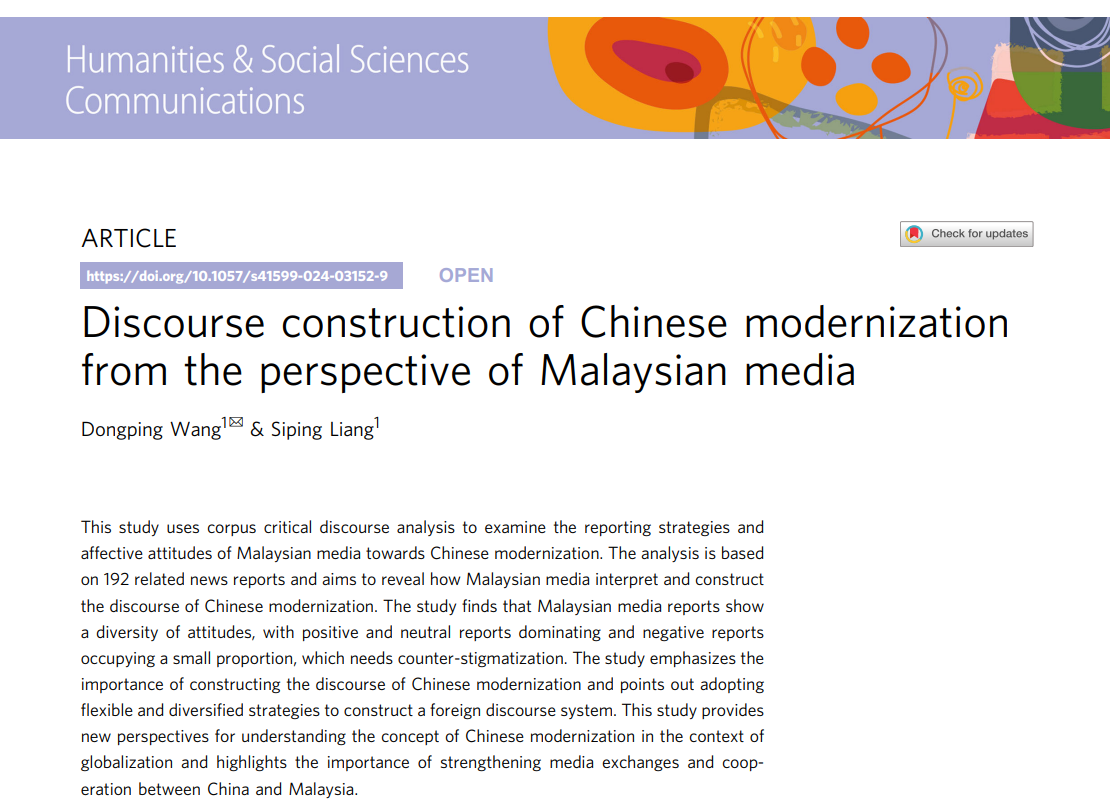 近日,我校色漫网 副院长汪东萍教授团队,以我校为第一完成单位,SpringerNature期刊Humanities and Social Sciences Communications发表Discourse construction of Chinese modernization from the perspective of Malaysian media论文。研究通过语料库分析马来西亚媒体如何建构中国式现代化话语,为基于受众国讲好中国式现代化故事提供了新视角,旨在增强中国式现代化国际传播力影响力,提升国家形象和文化软实力。