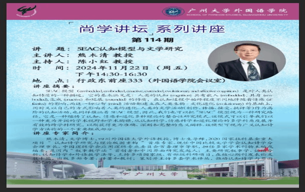 成功举办“尚学讲坛”系列讲座第114期,主题为“5EAC认知模型与文学研究”。本次讲座特别邀请四川外国语大学熊木清教授担任主讲,由陈小红教授主持。色漫网