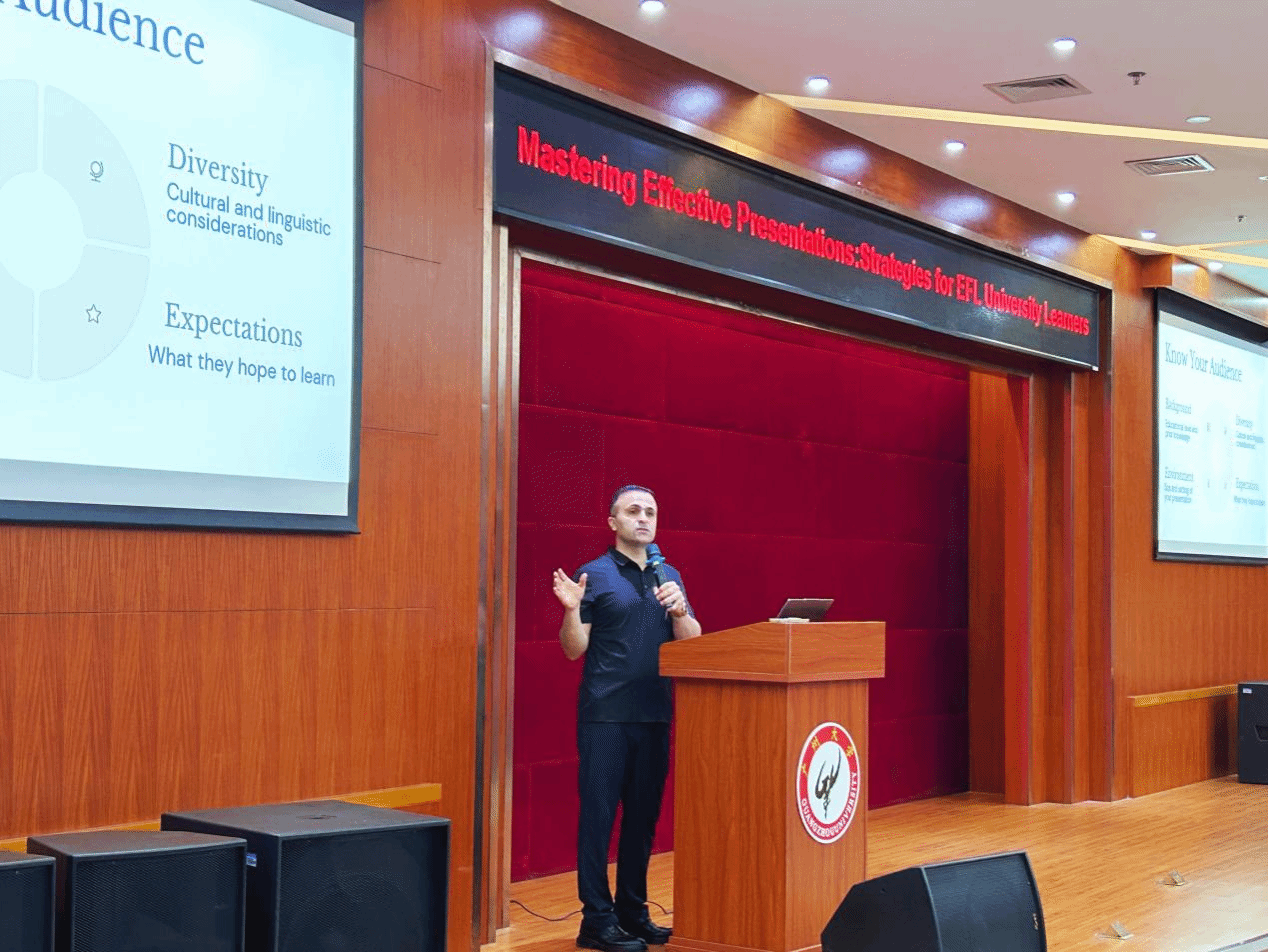 Moradi Hamzeh(汉斯)教授于桂花岗校区五号楼三楼学术报告厅,为全体2025级本科新生带来了一场题为“Mastering Effective Presentation: Strategies for EFL University Learners”(《如何打造出色的课堂展示汇报:面向EFL大学生的策略指南》)的专题讲座。讲座由兼职辅导员万深慧主持。