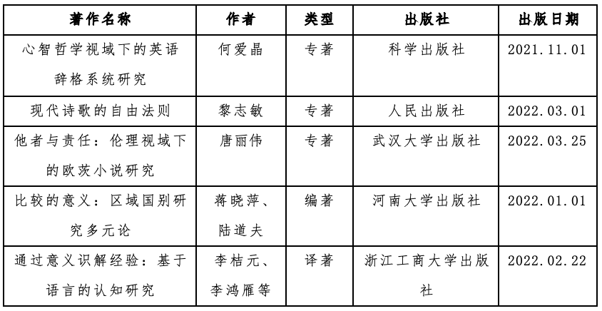 何爱晶教授、黎志敏教授、唐丽伟副教授分别在科学出版社、人民出版社和武汉大学出版社出版科研著作各1部;蒋晓萍教授和陆道夫教授编著科研著作1部;李桔元教授和李鸿雁教授等翻译科研著作1部。