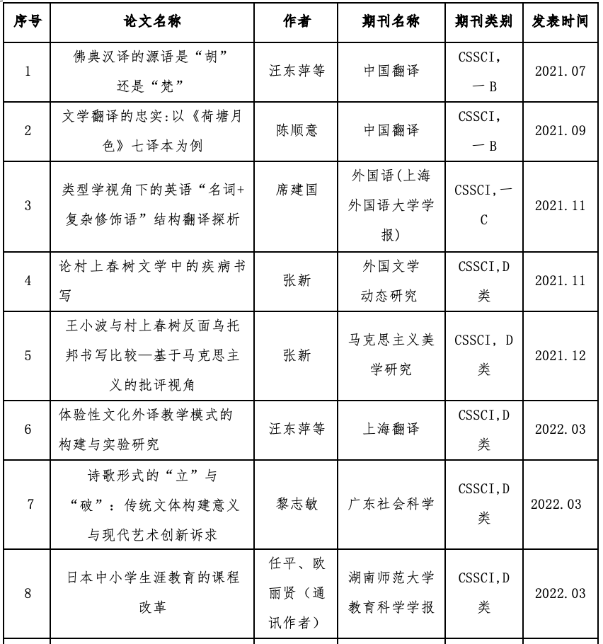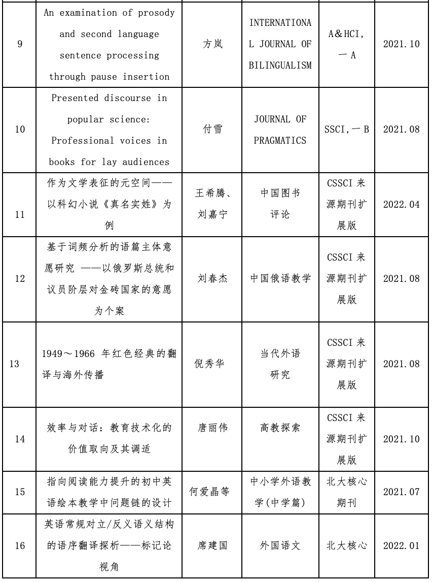 教师发表论文55篇,其中A&HCI、SCI/SSCI和CSSCI论文10篇、CSSCI(扩展版)4篇、北大核心期刊论文2篇,其他论文39篇。在10篇SCI/SSCI和CSSCI论文中,汪东萍教授、陈顺意博士发表一B论文1篇;席建国教授发表一C论文1篇;张新博士发表D类论文2篇;汪东萍教授、黎志敏教授、欧丽贤博士、王希腾博士分别发表D类论文各1篇,共6篇;方岚副教授发表A&HCI一类期刊论文1篇;付雪老师在SSCI一B期刊上发表书评1篇;另外,倪秀华副教授、唐丽伟副教授、刘春杰博士、王希腾博士分别在CSSCI(扩展版)期刊发表论文各1篇,共4篇;何爱晶教授、席建国教授分别在北大核心期刊发表论文1篇,共2篇。除此之外,色漫网
