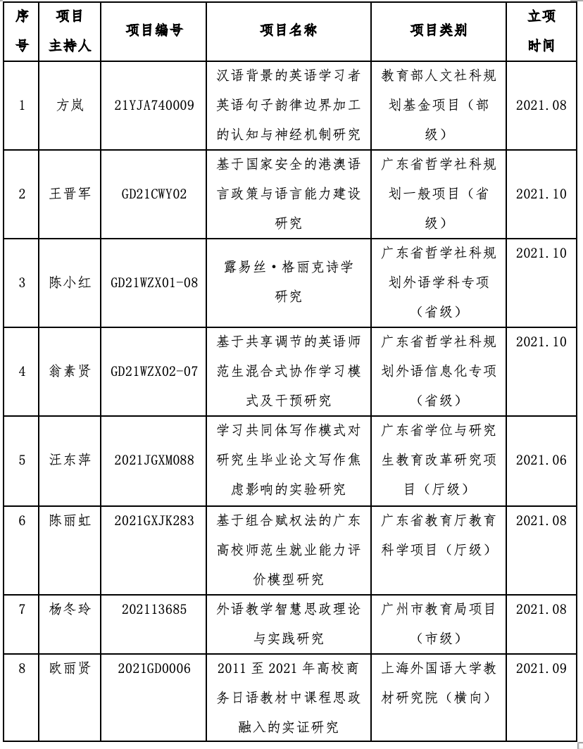 教师有8个项目立项,其中,方岚博士荣获2021年度教育部项目、王晋军教授荣获广东省哲学社科规划项目、陈小红教授获广东省哲学社科规划外语学科专项项目、翁素贤老师获广东省哲学社科规划外语信息化专项、汪东萍教授荣获2021年广东省学位与研究生教育改革研究项目、陈丽虹副教授获广东省教育厅教育科学项目、杨冬玲副教授获广州市教育局项目、欧丽贤博士承担1项上海外国语大学的横向项目。