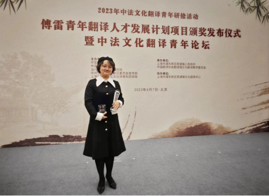主要承担法语笔译课程,她主持的项目“《从前有个寓言》法译汉翻译实践”此次顺利结项,领取了结项证书和奖杯。