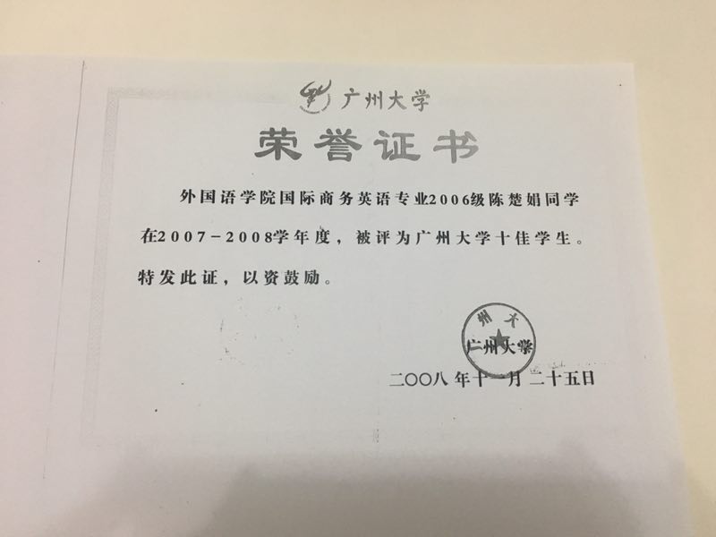 (图:十佳学生荣誉证书复印件)