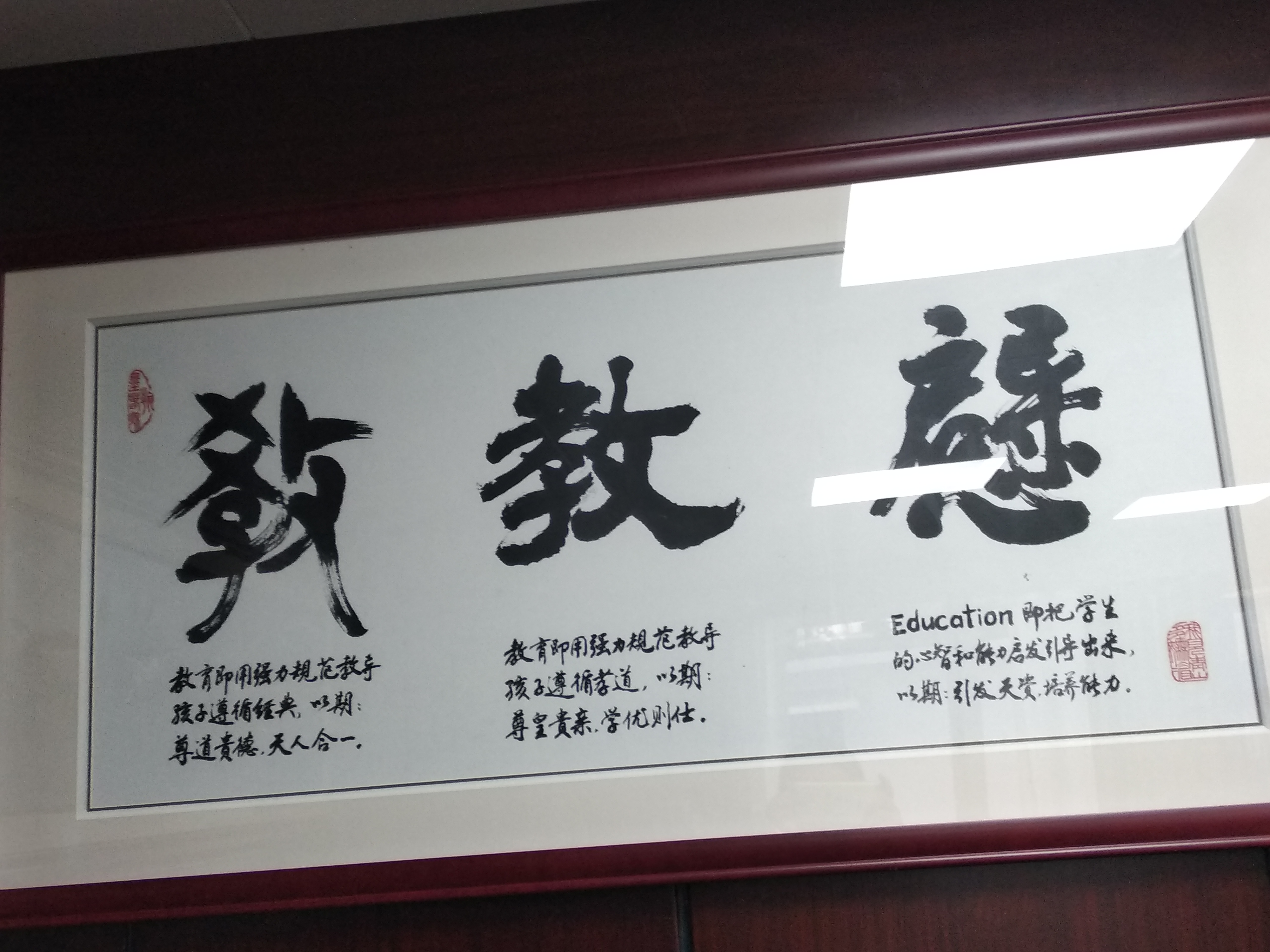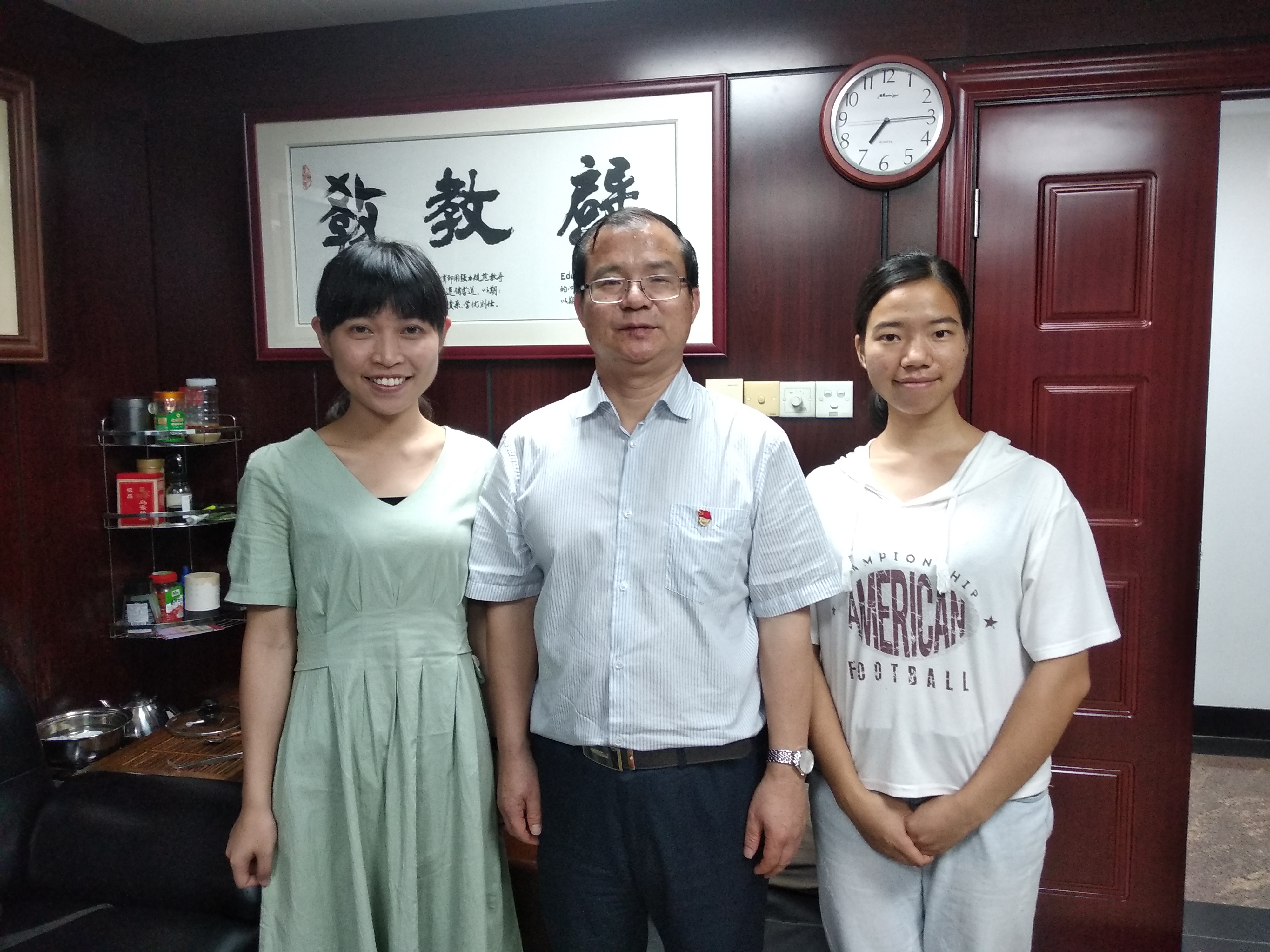 在教育行业工作三十多年,师兄对教育的理解可以浓缩为其办公室里挂着在墙上的三个“教”字。他还向我们细细讲述这三个“教”字的含义。(请见视频)师兄认为,我们的教育要借鉴西方的教育理念,多启发引导学生。他还表达了对广州学子的希望:“如果世界上有某个领域只有五十到一百人能掌握,而这五十到一百人中便有一些是我们广州的学子,这是广州的教育目标所在。”