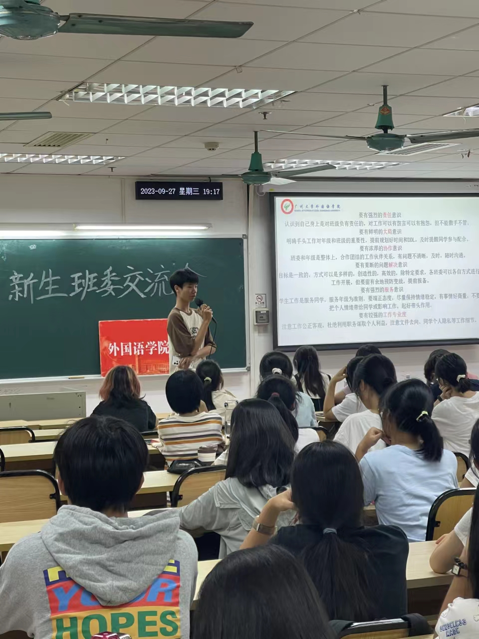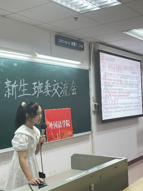会议第四项——优秀班委经验分享,由日语212班班长费晓娟同学为新生班委进行分享。费晓娟从大学班委的主动性入手,详细讲解如何管理好班级的方法,并总结了“一望、二闻、三问、四切”的经验。一望是立足班级特色、提高班级凝聚力,二闻是将心比心、真正倾听同学们的心声,三问是及时联系、多询问同学需求,四切是注重实践、提升个人能力。通过师姐的倾囊相授,相信班委们都有信心做好班委工作。
