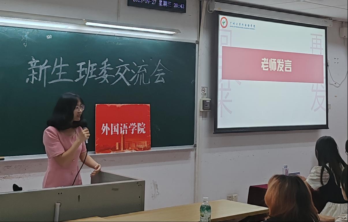 于桂花岗5号楼开展新生教育系列活动之2023级班委交流会。本次大会由级委刘佳婧主持,2023级全体班委参与,年级辅导员周莹老师、兼职辅导员郭亿琳、吴雨晴出席交流会。