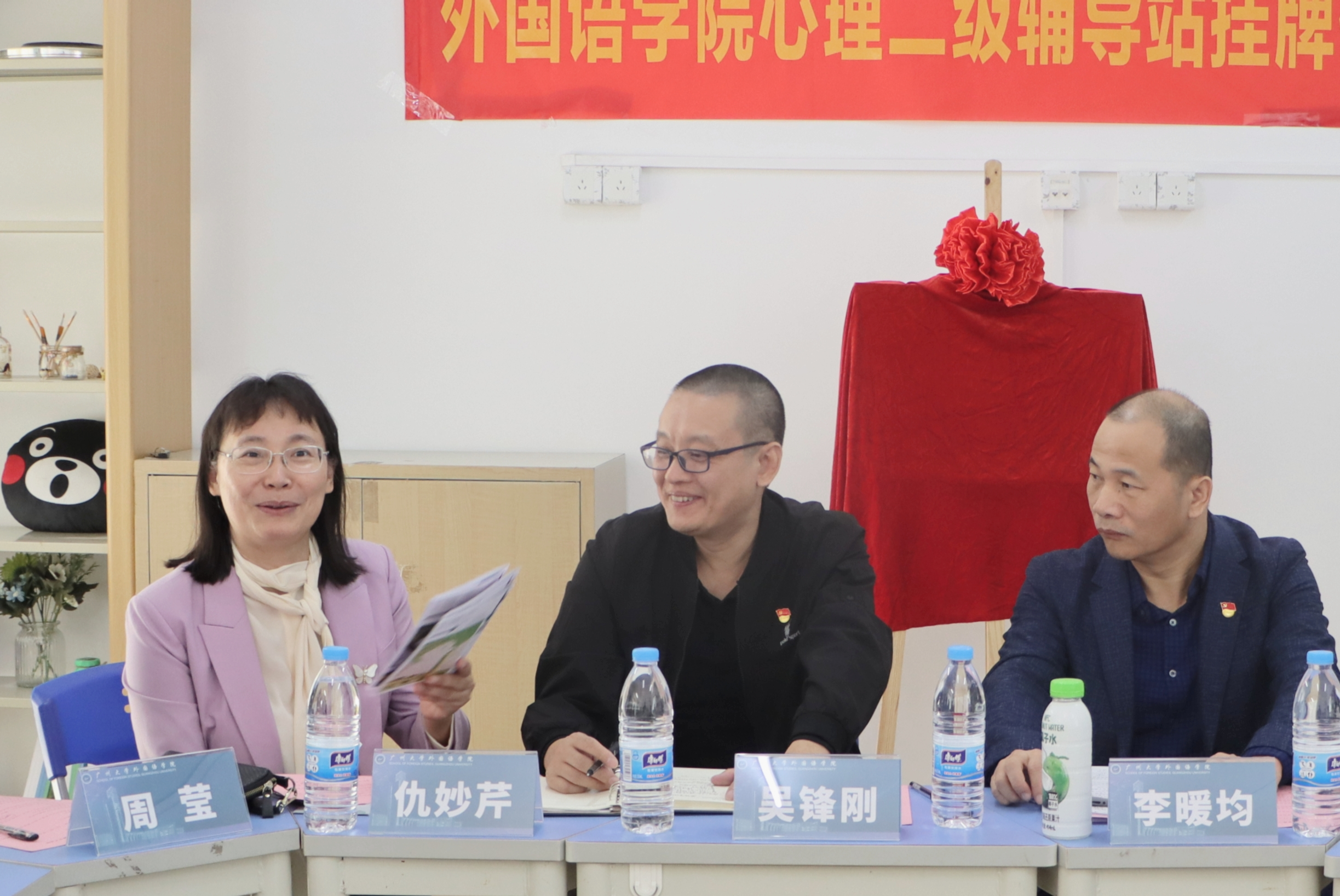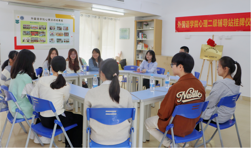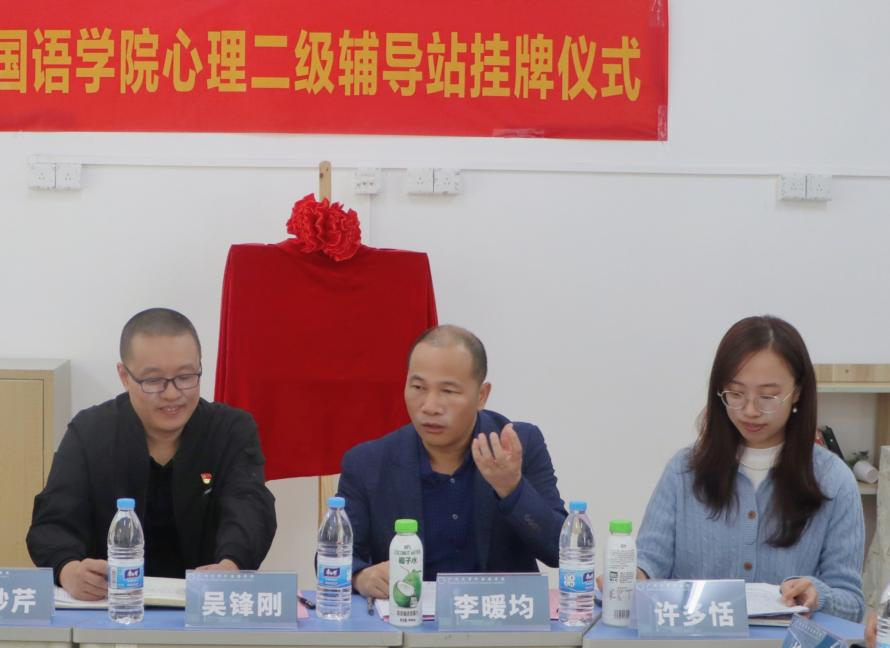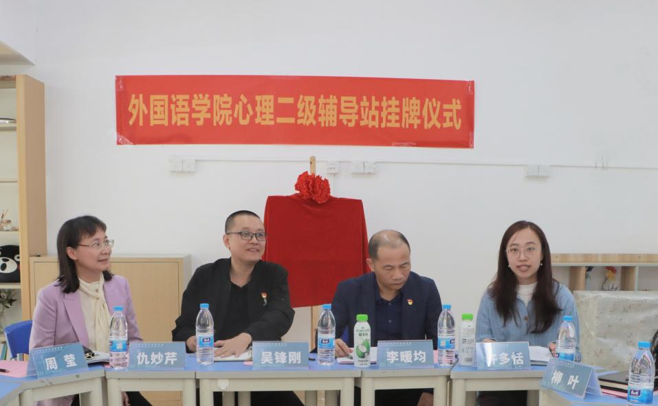 “润心”心理辅导站挂牌仪式于梅苑10栋五室一站三楼心情驿站举行。我校学生处副处长吴锋刚、心理健康教育与咨询中心主任仇妙芹,外国语学院党委书记李暖均、学院党委副书记许多恬、心理工作执行人周莹、五室一站负责人柳叶,以及各年级学生心理委员、学院心理卫生协会学生骨干参加挂牌仪式。仪式由学院党委副书记许多恬主持。