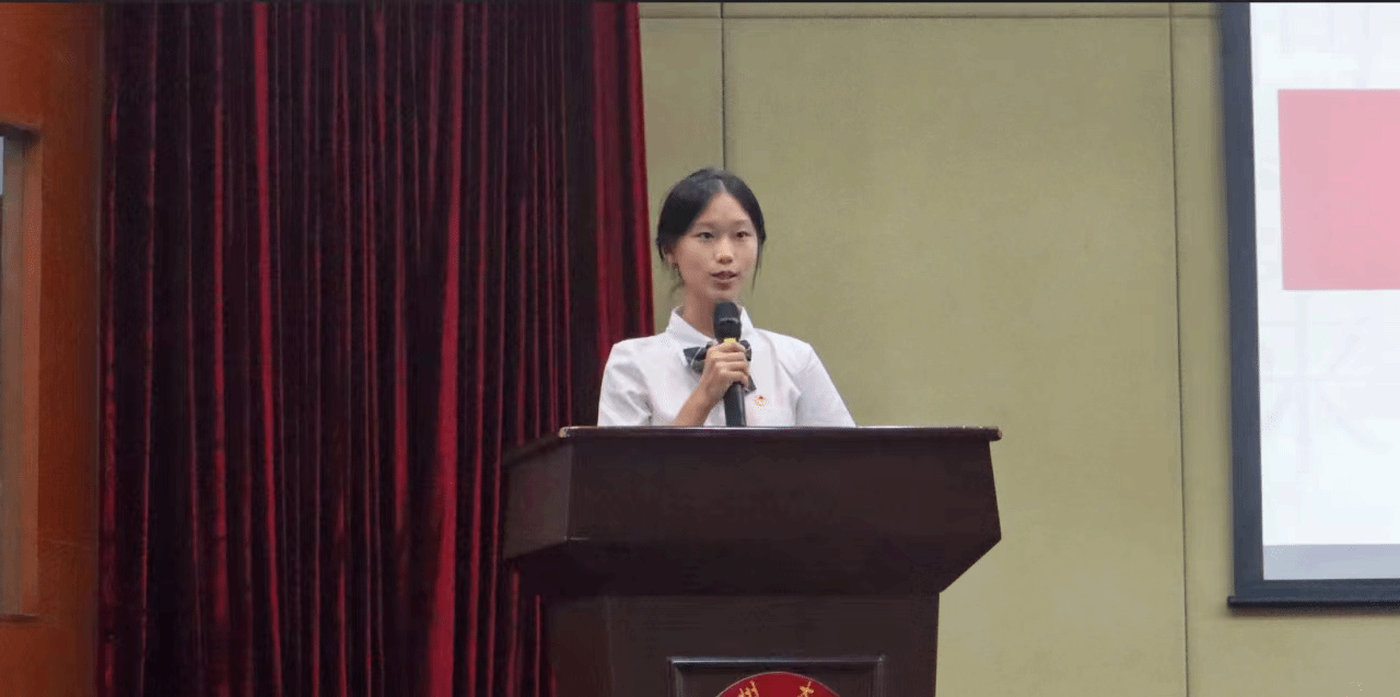新生代表英语241班范思茹同学表达了与大家共聚广大的喜悦。她提出在学习中寻找乐趣,在实践中积累经验,以优秀党员为榜样,做到修身立德且不忘初心,以青春奋斗为民族复兴贡献力量。