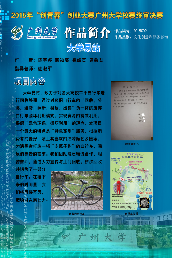 第十一届学术科技节的项目之一,为鼓励我校学生培养创新意识和创业精神,同时为第十届“挑战杯”全国大学生创业计划竞赛做准备。“大学易站”项目团队是由英语133班的陈宇婷、149班曾敏君以及工商管理学院赖颖姿、崔结英共4位同学跨院组建。该项目以回收与销售大学城内二手自行车的特色服务在众多申报项目中脱颖而出进入决赛终审答辩,项目团队在项目展示答辩中表现出色,获得在场评委的关注与认可。