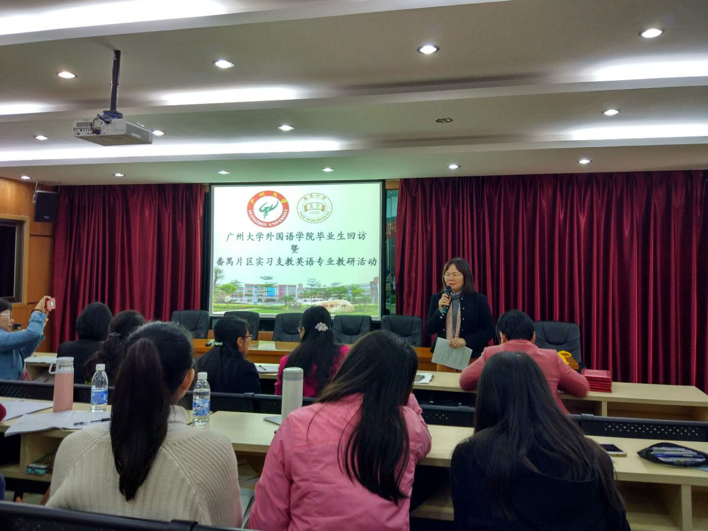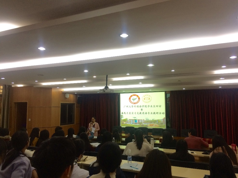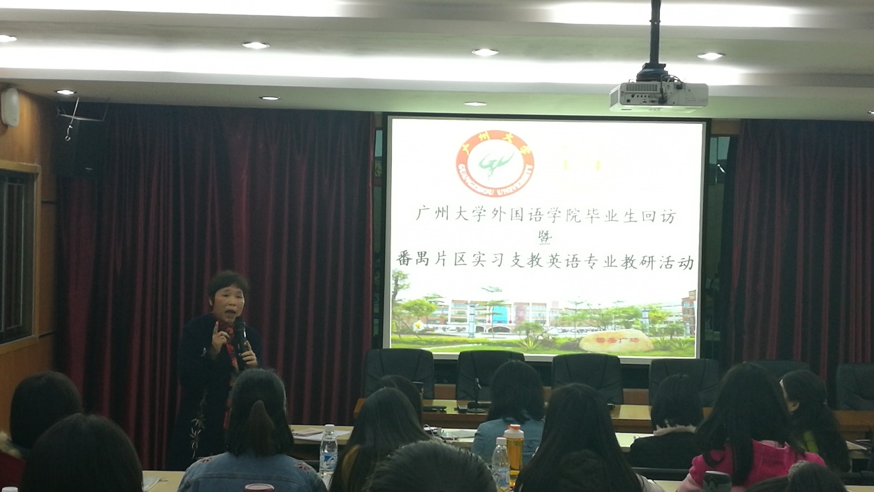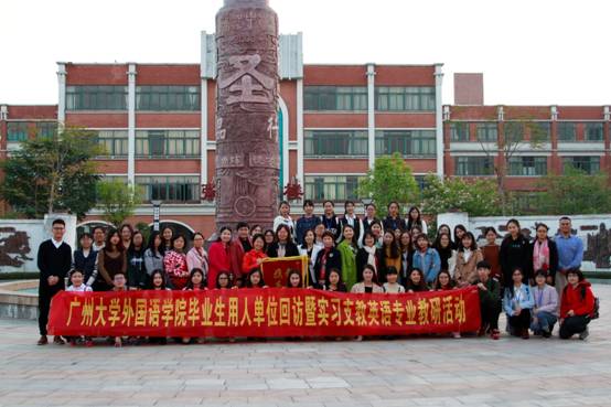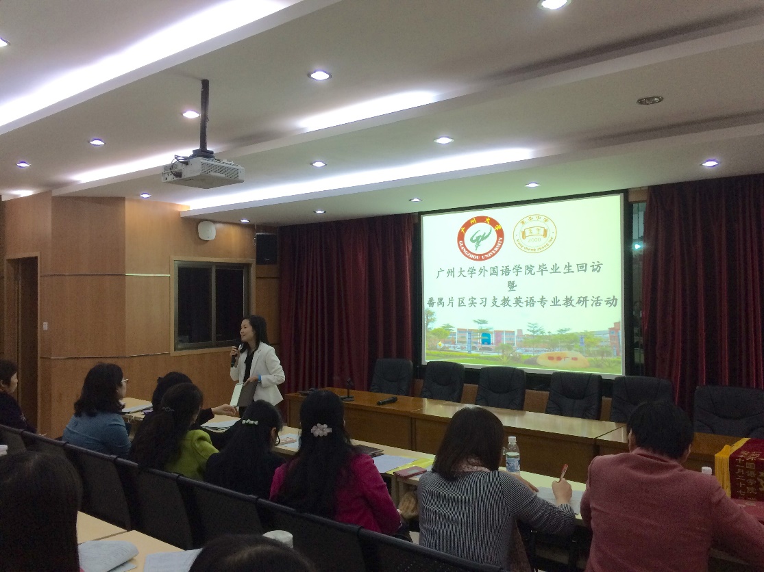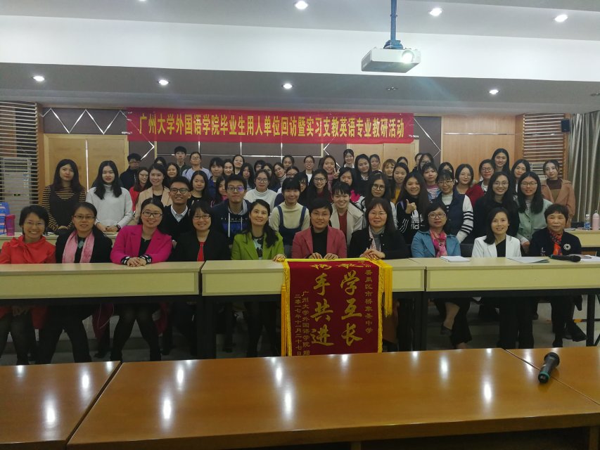 毕业生回访暨番禺片区实习支教英语(教师教育)专业教研活动在番禺区市桥象圣中学举行。苏远连副院长、鄢智青副书记等院系领导、老师一行七人出席了本次活动。活动还邀请了番禺区英语科教研员冯页老师、市桥教育指导中心黄美燕老师、象圣中学陈丹波校长、易翠红主任等领导以及多位骨干教师参与指导。