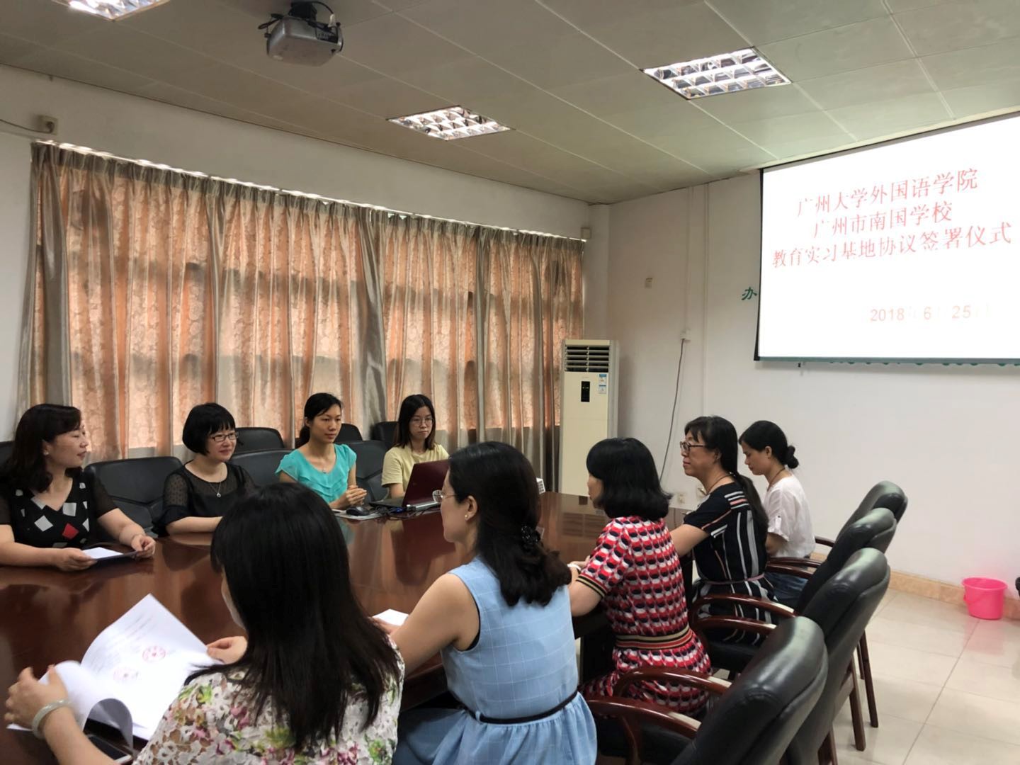 与广州市南国学校教育实习基地签署仪式在广州市南国学校举行。英语系副主任陈丽虹(基地负责人)、杨冬玲副教授和广州南国学校李荣荣校长及相关部门负责人、英语科组教师等人出席了此次仪式。