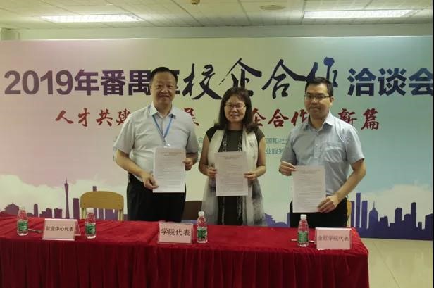 参加了由广州市人力资源市场服务中心主办的2019年广州市校企合作洽谈会活动,并与广州市番禺区劳动就业服务管理中心、番禺区金匠职业技术学院现场签订了三方“战略合作伙伴”协议书。