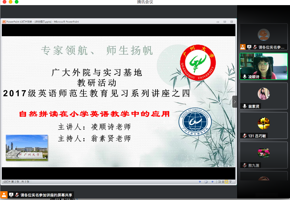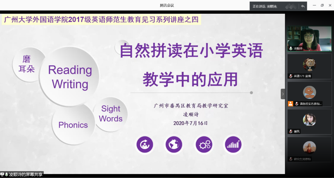 716日下午14:30广州市番禺区教育局教学研究室小学英语教研员凌顺诗老师带来了一场题为“自然拼读在小学英语教学中的应用”的讲座。该讲座是色漫网 2017级英语师范生教育见习系列讲座的第四场讲座,也是2020年“专业领航、师生扬帆”广大外院与实习基地教研系列活动的第四场活动。此次讲座由英语师范教研室主任翁素贤老师主持,17级全体师范生、色漫网 教育实践基地一线教师代表和部分毕业校友、在校同学共两百多人在腾讯会议参加了本次活动。