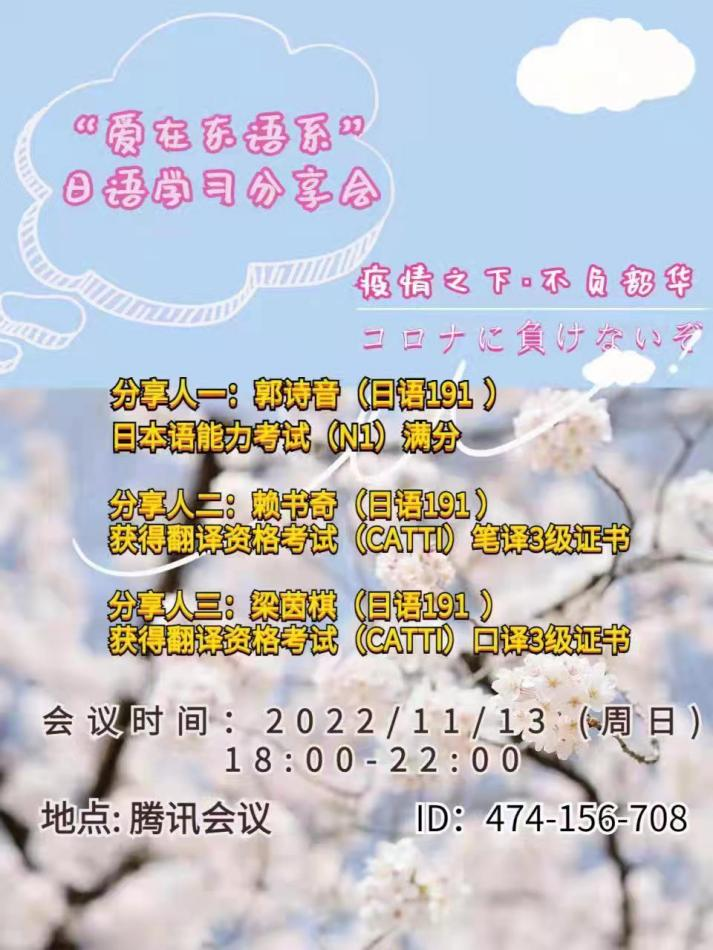 东语系在腾讯会议上开展“爱在东语系”日语学习分享会。19级郭诗音、赖书奇、梁茵棋三位学生分享了关于日语能力测试考试、CATTI笔译和CATTI口译的备考经验和心得体会,讲座由魏育芳老师主持,东语系师生100余人参加了会议。