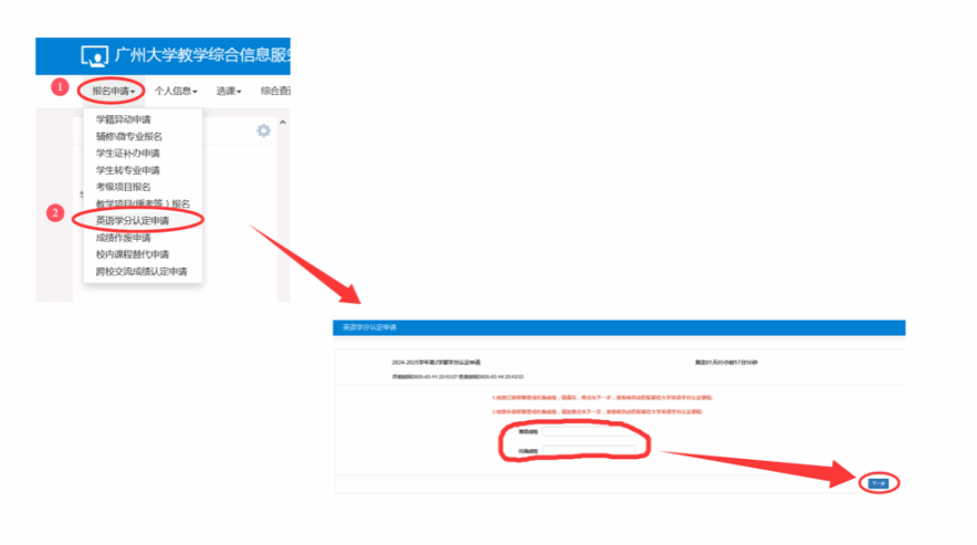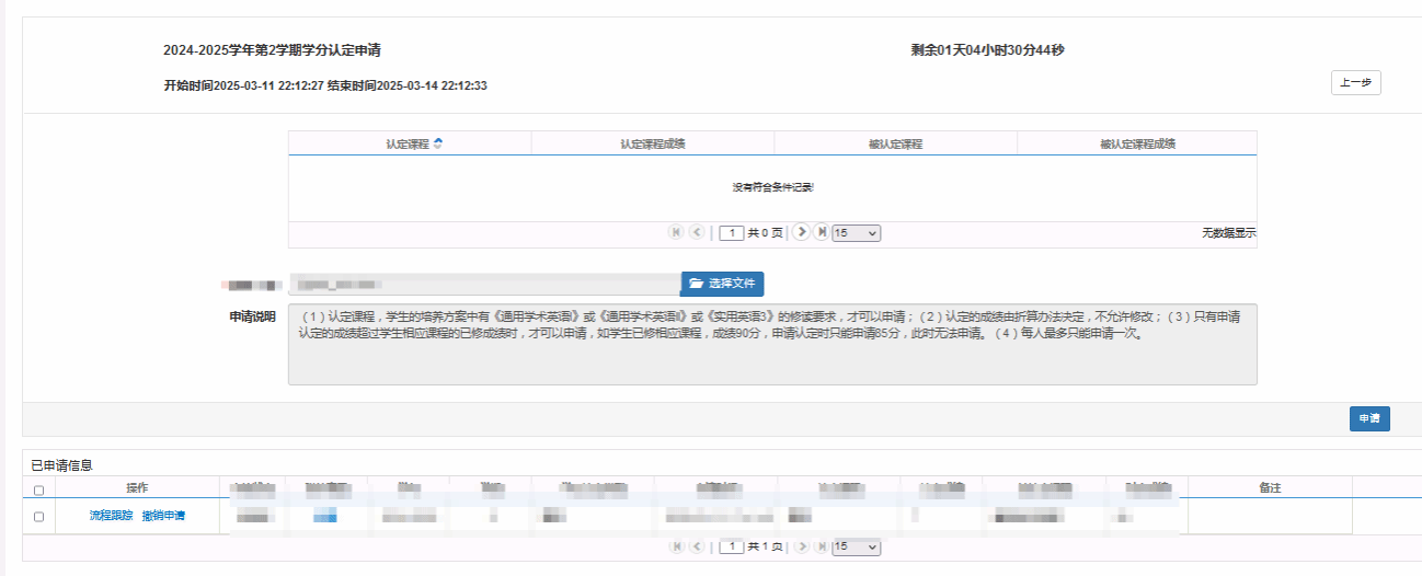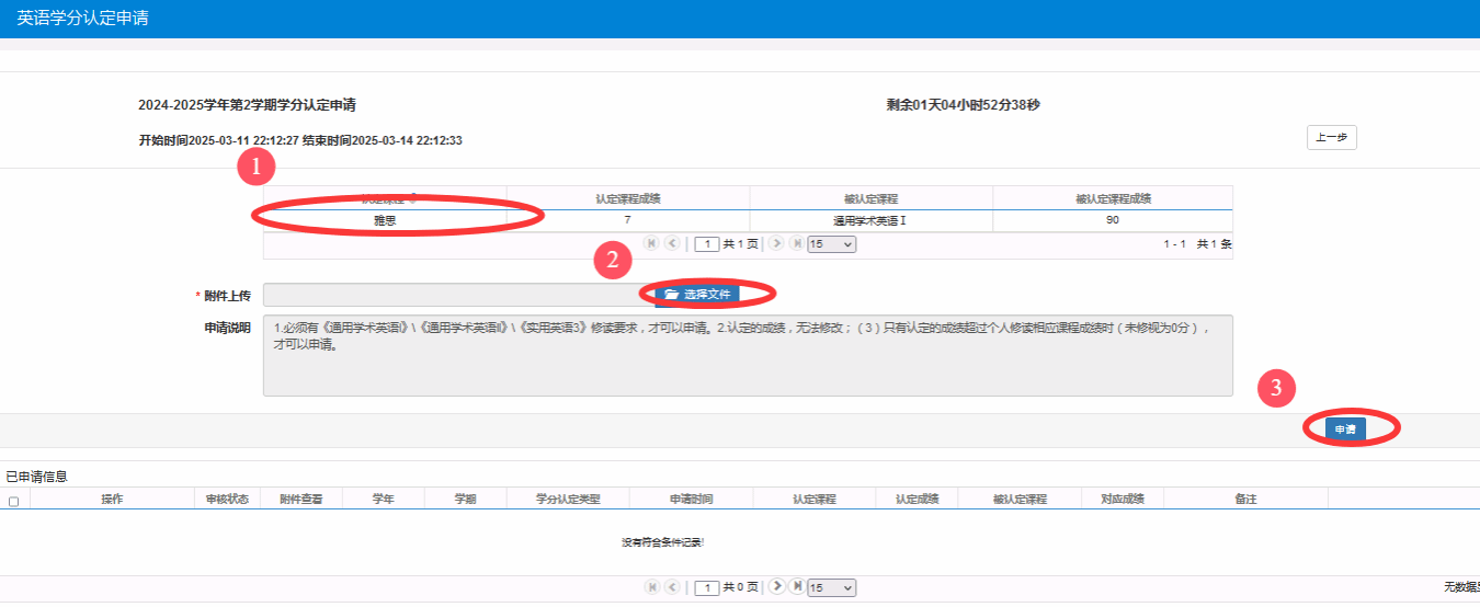 说明:(1)认定课程,学生的培养方案中有《通用学术英语I》或《通用学术英语II》或《实用英语3》的修读要求,才可以申请;(2)认定的成绩由折算办法决定,不允许修改;(3)只有申请认定的成绩超过学生相应课程的已修成绩(未出成绩视为0分)时,才可以申请,如学生已修相应课程,成绩90分,申请认定时只能申请85分,此时无法申请。(4)在校期间,每人最多只能申请一次;(5)课程的最终成绩以申请认定成绩与课程考核成绩的最高成绩决定。