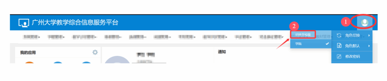 点击右上角,“人像图标”-》选择“角色切换”-》选择“切换至校级”。
