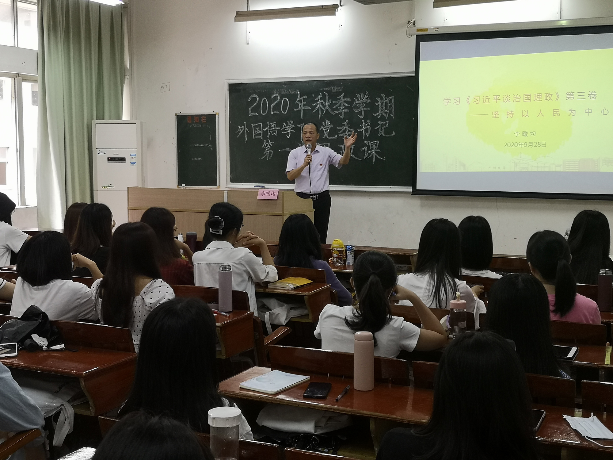 党委书记李暖均以“学习《习近平谈治国理政》第三卷——坚持以人民为中心”为题在桂花岗校区为59名新入学的2020级学科教学(英语)专业研究生上思政第一课。李书记介绍了《习近平谈治国理政》第三卷的基本内容,重点强调了习近平总书记在纪念朱德同志130年周年座谈会上提到的战略思维、历史思维、辩证思维、创新思维、法治思维、底线思维,并结合当下的时政热点,突出了中国“坚持以人民为中心”的治国理政思想。李书记用习近平在全国抗击新冠肺炎疫情表彰大会上的讲话,对那些为保护人民生命安全的“人民英雄”致以最诚挚的敬意,并寄希望同学们能够像他们那样,勇于挑起时代的重任,不负韶华。