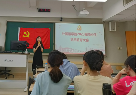 在文新616教室召开2023届毕业生党员教育大会,学院党委书记李暖均、党委副书记许多恬、大学英语部党支部书记谭苏燕、英语系党支部书记蒋金运、英语系党支部副书记胡安奇、学生第一党支部书记徐慧、学生第二党支部书记任洪蔚、桂花岗校区学生党支部书记陈远明和全体2023届毕业生党员参加了本次大会,大会由陈远明主持。