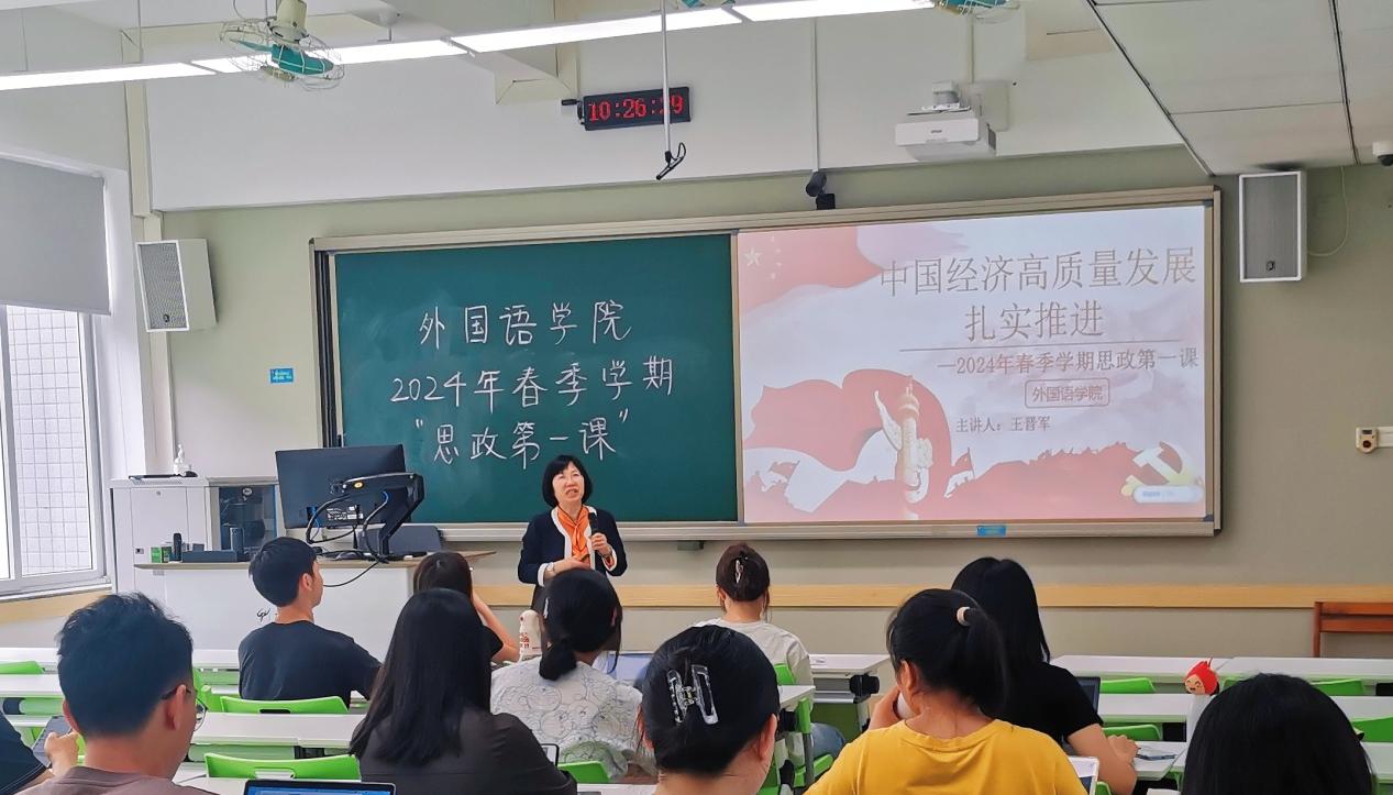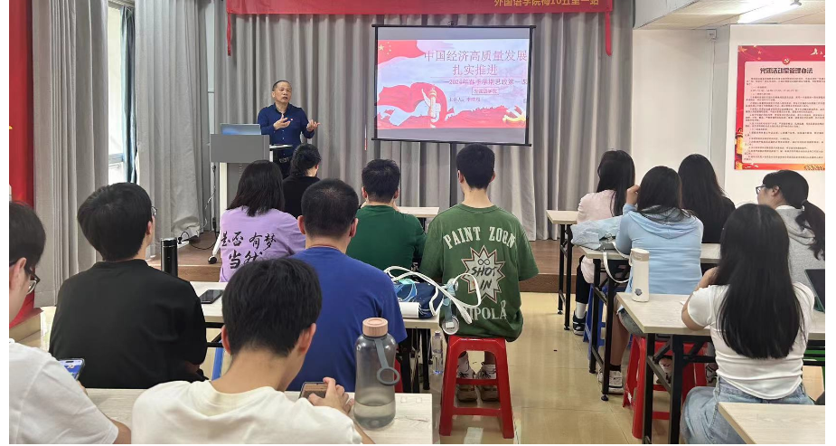 暖均书记以“中国经济高质量发展扎实推进”为题,围绕经济发展趋势、科技创新等内容引导学生思考中国经济的现状与未来,强调新时代青年应深刻理解国家经济大势,认清面临的机遇与挑战。课上,李书记鼓励同学发挥专业优势,在国际平台用外语讲好中国故事、传播好中国声音,贡献外语学子的力量。