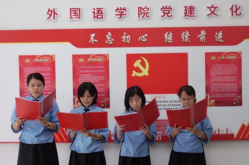 本次会议由党支部书记李莹莹主持。会上,法语学习小组和日语学习小组的教师党员身穿五四青年装,分别用法语和日语诵读了《要有高度的文化自信》(法文版)和《提高国家文化软实力》(日文版)(节选自《习近平谈治国理政》第一卷《六、建设社会主义文化强国》和第二卷《九、坚定文化自信》)。