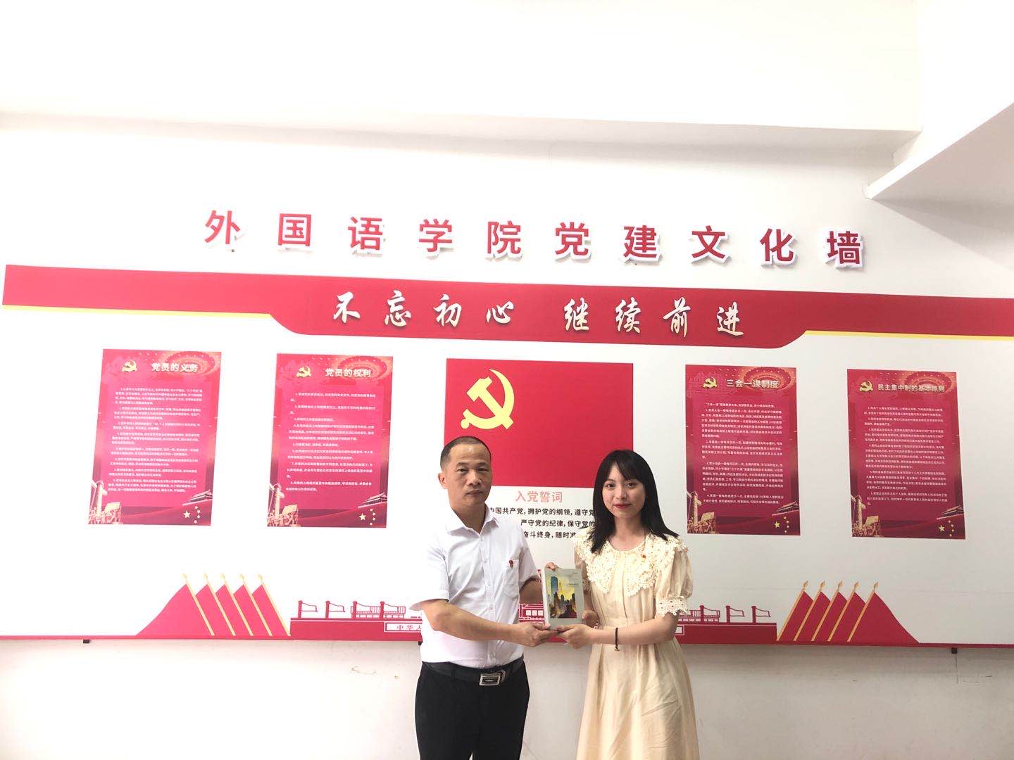 (李暖均书记、李慧副书记接受毕业生党员们的赠书)