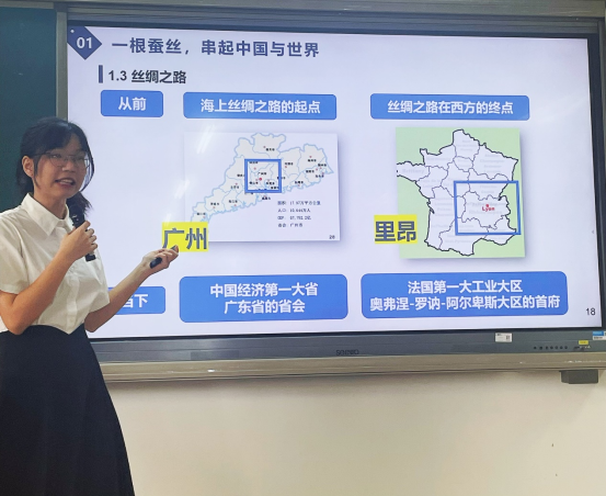 本次活动以讲座为载体,从一根蚕丝谈起。郑利豪同学首先简明概要地梳理了中国养蚕术的发展与西传历史,从而带领听众走进连接中国与世界的丝绸之路故事。广州是海上丝绸之路的始发地,里昂是陆上丝绸之路的终点站。两座城市远隔千里而牵手,成就了一段美好故事。