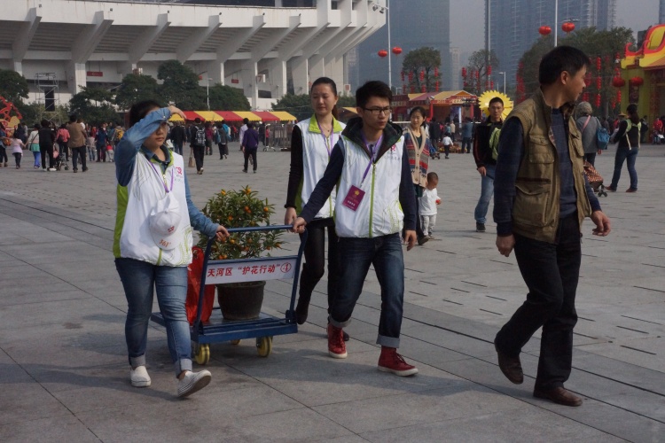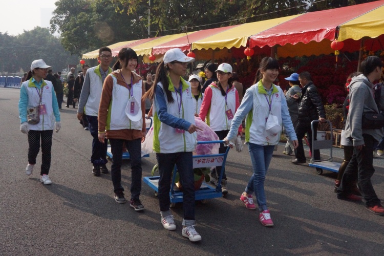 在天河花市中,随处可见“护花”志愿者的身影。他们身着绿色志愿者服,在新年之际给市民带来了亲切温暖的问候和贴心便利的服务。此次“护花行动”主要是在花市期间向购花的市民提供免费送花服务,为市民提供免费饮用水以解渴,向花农送姜汤等。最后在花市结束之后,志愿者们会倡导花农不要砸损余花,转由志愿者收集并送往福利院等机构。在花市开始的第一天上午,志愿者们还有一个特别任务,即带领福利院的小朋友们游览花市。而在志愿者服务站,色漫网