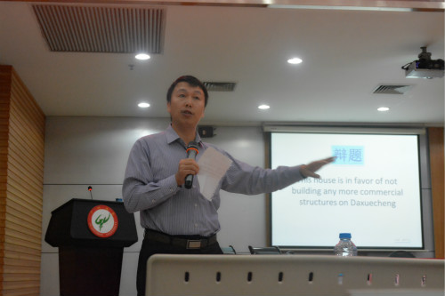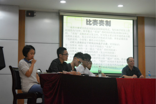 本次英语辩论赛采用的是英国议制辩论形式,双方辩手一一交替发言,在一方演讲的2-6分钟内,另一方可提出质询,双方交锋充满火药味。辩题也充分洋溢着时代气息——The house is in favor of not any more commercial structures on Daxue Cheng.针对辩题,正方代表的是government site,他们都强调了大学学习的重要性,认为大学生总会无形中受到形形色色的商品潮流的影响,越来越多的商业建筑会让同学们迷失方向,影响到学业。而反方作为opening site,对此反驳道,大学生不仅要学会学习,更要尝试接触商界,学会交流沟通的社会技能。双方均列举出身边的例子作为论据,普通真实而引人思考。越来越多商业建筑的建成是给同学们提供了更大的便利,还是对同学们的学习生活带来了困扰呢?自制力较强的同学是否就不会受到影响呢?