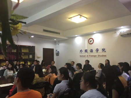 讲座正式开始之前,肖坤学院长向在座师生简要介绍了丁建新教授的个人经历以及学术成果。接着,丁教授以词汇研究的历史为线索,详细阐释了西方不同学派从不同视角对词汇开展的研究。从古老的“伦敦学派”到上个世纪三十年代的“美国结构主义”,从乔姆斯基的“形式语言学”到韩李德的“功能语言学”,最后到上世纪末出现的“语料库语言学”,丁教授引经据典,用文学化的语言全面而深刻地展示了对词汇研究的整个发展脉络。讲座中,丁教授根据自身的研究,创造性地提出了功能主义的“六大新核心思想”,包括“人类学思想”、“进化论思想”、“相对论思想”、“语法作为文化的思想”、“主体间性思想”、“社会生物学思想”,让人眼前一亮。整个讲座过程,丁教授言语幽默风趣,内容理论性极强,引人深思,赢得了老师和同学们的阵阵掌声。