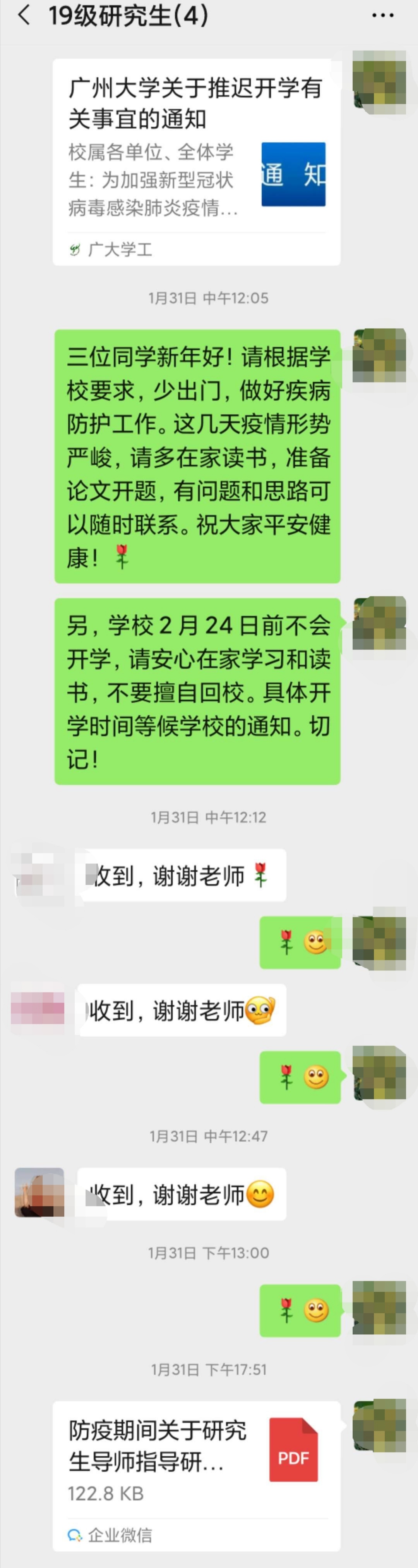 疫情发生以来,研究生导师们第一时间与研究生取得联系,对不同年级研究生在学业和研究上进行了分类指导,鼓励研究生安排好居家学习和研究,并把人文关怀传递给每一位学生。
