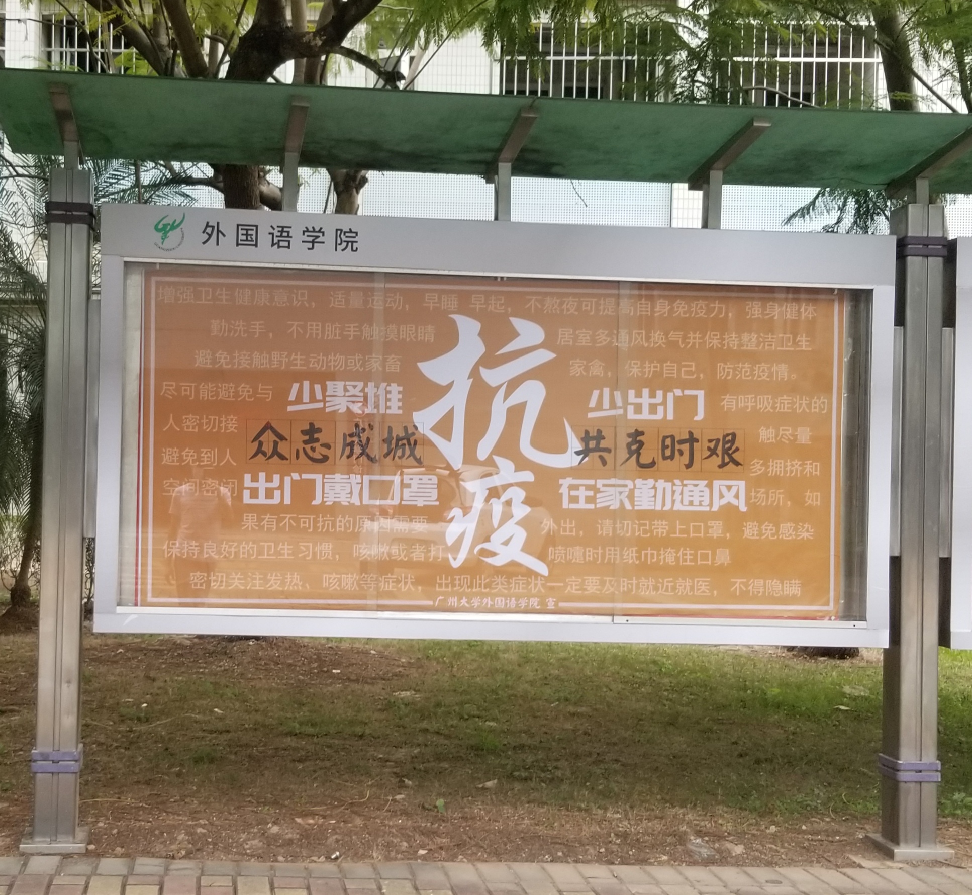 学院团委充分利用桂花岗校区及大学城校区宣传橱窗,张贴海报宣传防疫抗疫知识。在外国院学院团委公众号开设“防疫前线”专栏,推出5篇关于防疫宣传推送;开展“表意三行、助力华夏”三行情书大赛,外院学子充分发挥专业优势,共创作英日法三行情诗130篇向祖国和人民、向一线工作者传递爱和希望。英语172班陈铭姗、英语194班吴妙琼摄制原创作品为湖北武汉送祝福。英语171班方树珊对居家学习的中学生进行免费的线上“一对一高考陪伴”,共克时艰。