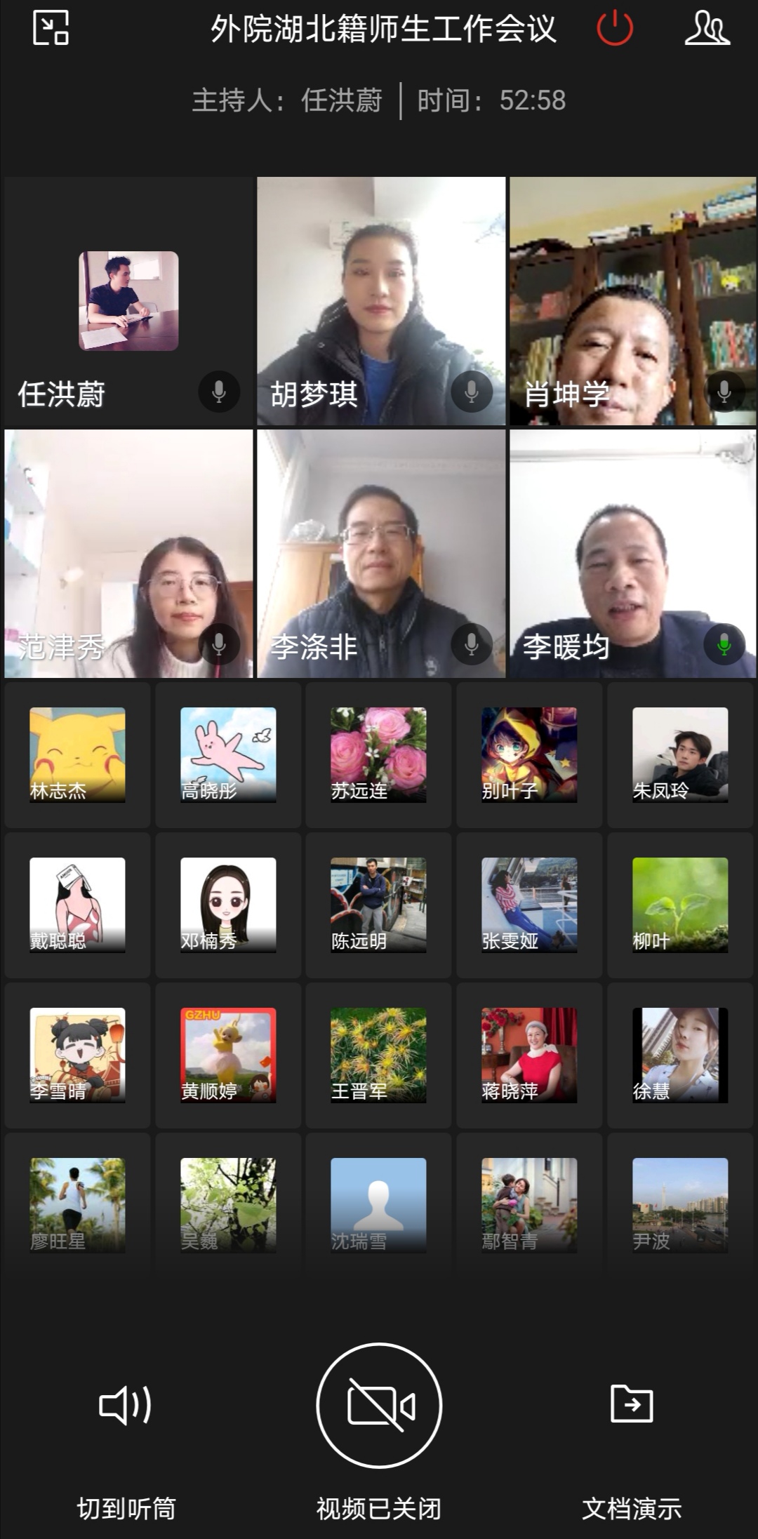 视频连线在鄂3名教师和11名学生。学院党委书记李暖均、院长肖坤学等班子领导以及全体辅导员老师等逐一了解14名在鄂师生目前所在地区的疫情防控及自身的工作、学习和身体近况,希望大家做好防护工作,待疫情结束,健康、顺利地返回校园学习、工作和生活。
