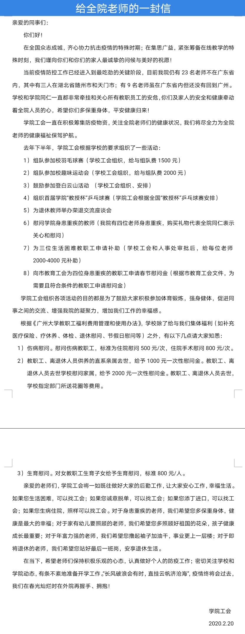 2月18日,学院工会主席尹波购买84消毒液、乙醇消毒液、口罩等防疫物资,一部分设法邮寄给滞留湖北的同事,为全院同仁送去牵挂和祝福;另一部分放置于学院办公室,供老师们返校工作时使用。心系学院同仁,2月20日学院工会发出《给全院老师的一封信》,给全院老师们致以最诚挚的问候和最美好的祝福,待疫情过去,在春光灿烂时老师们同聚外院握手、拥抱!