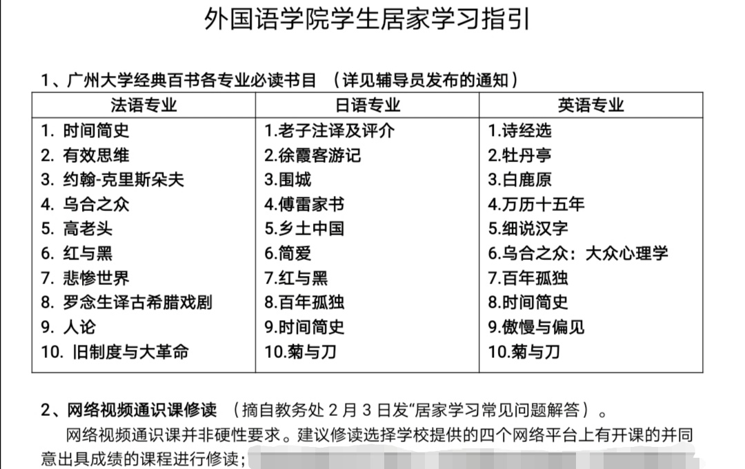 学生居家学习指引”,“云”引导学生珍惜寒假时光,认真阅读英语、日语、法语专业精心挑选制定的“经典百书必读书单”。