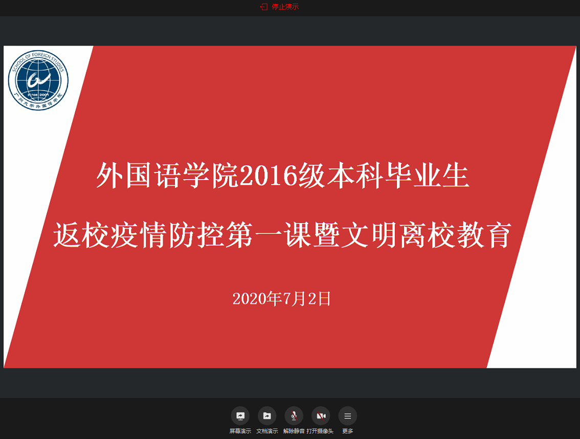 为确保疫情防控和返校离校工作顺利推进,6月30日上午和7月2日上午,学院利用企业微信平台分别召开研究生和本科生“返校防疫第一课暨文明离校教育”, 院长肖坤学、党委书记李暖均、副院长王晋军、副院长苏远连、党委副书记李慧和毕业班辅导员黄顺婷、徐慧以及全体毕业生参加了会议。会议向全体毕业生的返校表示热烈的欢迎,同时认真解读与学习《疫情防控期间住宿管理补充规定》文件精神,提醒毕业生们严格遵守校规校纪及其他疫情期间防控管理要求。