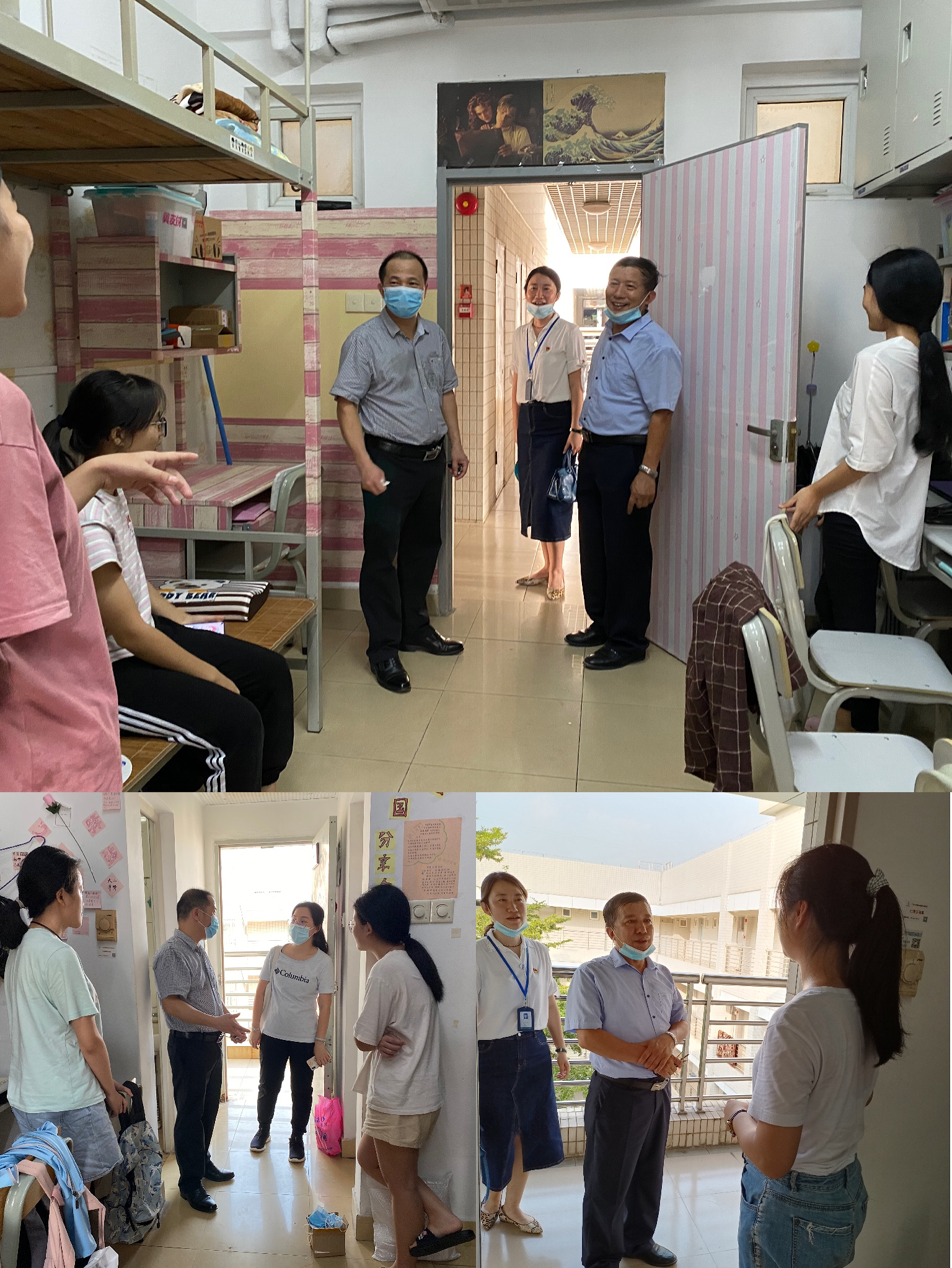 院长肖坤学、党委书记李暖均、副书记李慧、班主任陈小红、冯雪飞及学工办辅导员一起走访学生宿舍,看望在校学生。学院领导及老师们高度关注关心同学们的学习及生活情况,提醒同学们要结合学校防疫安排做好疫情防控工作,室内勤通风、勤消毒,有需求要及时向学院反映。