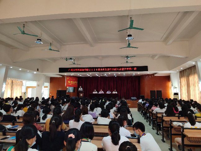 于9月17号在桂花岗校区小礼堂相继开展2020级新生见面大会暨开学第一课。院长肖坤学教授、学院党委李暖均书记、副院长苏远连教授、学院党委李慧副书记、东语系系主任彭英老师,英语201班班主任于伟昌老师、学工办全体辅导员及2020级全体新生参与了大会。