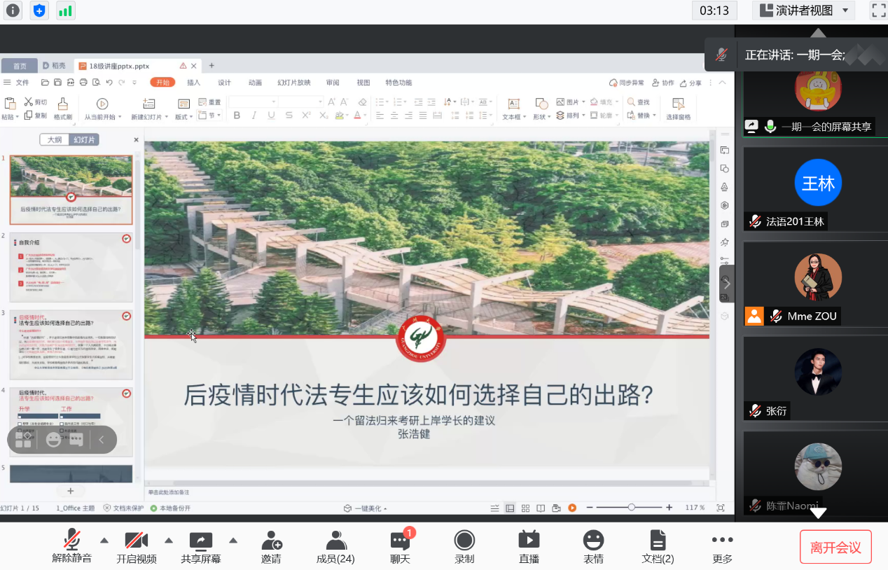 5月9日上午,我校外院2020届法语毕业生张浩健同学带来了主题为“后疫情时代法专生应该如何选择自己的出路”的线上讲座。西语系主任邹琰老师和法语专业18级、19级、20级部分同学共同参与了这场线上讲座。
