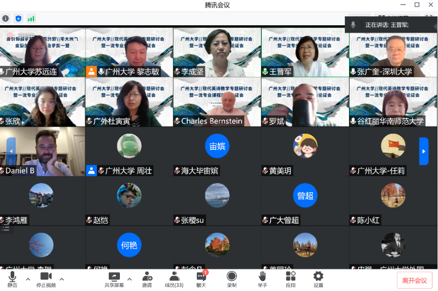 “现代英诗教学专题研讨会暨一流专业课程建设论证会”在线上(腾讯会议)隆重举行,国内外专家学者云端会晤,就现代英诗教学专题进行研讨,并为一流专业课程建设建言献策。