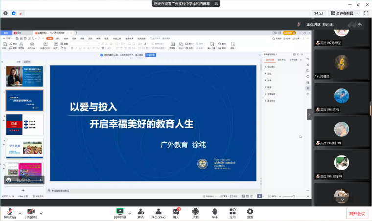 2022年8月31日上午,广东外语外贸大学实验中学徐纯校长为学院师生带来了题为“以爱与投入开启幸福美好的教育人生”的讲座。讲座在腾讯会议上进行,由学院副院长苏远连教授主持,全体实习带队教师参加了活动。