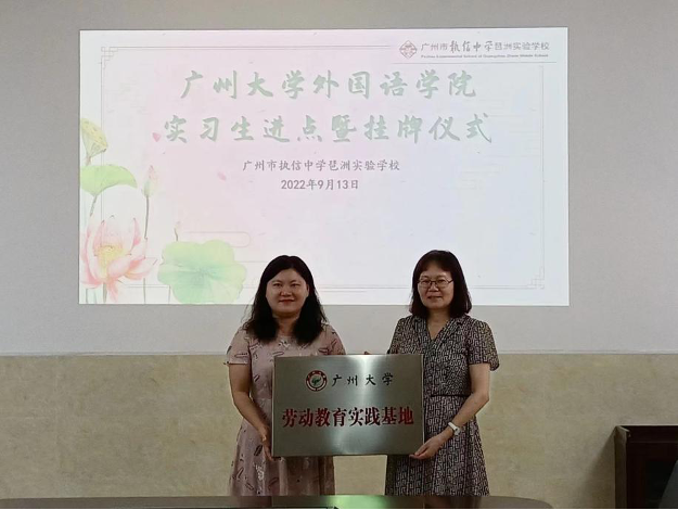 副院长苏远连教授、英语系副主任陈丽虹副教授、师范教研室马静雅副教授以及11位2019级英语师范实习生一行赴广州市执信中学琶洲实验学校参加教育实习进点会,并举行校级劳动教育实践基地挂牌仪式。广州市执信中学琶洲实验学校党支部书记、校长张文煊、教导处许晓云、叶昕瑶主任、英语科科组长赵鹏东以及初一和初二级组的级组长、英语科任教师和班主任出席了活动。