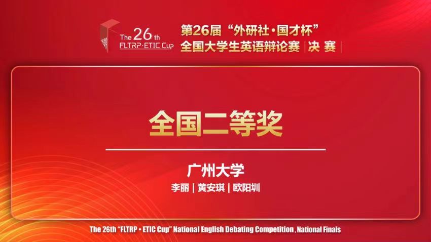 2024年6月1-2日,第26届“外研社·国才杯”全国大学生英语辩论赛(FLTRP-ETIC Cup)全国决赛在线上举行。我校2022级法学院法学专业黄安琪和2022级电子与通信工程学院物联网工程专业欧阳圳两位同学组成的广州大学代表队,在色漫网