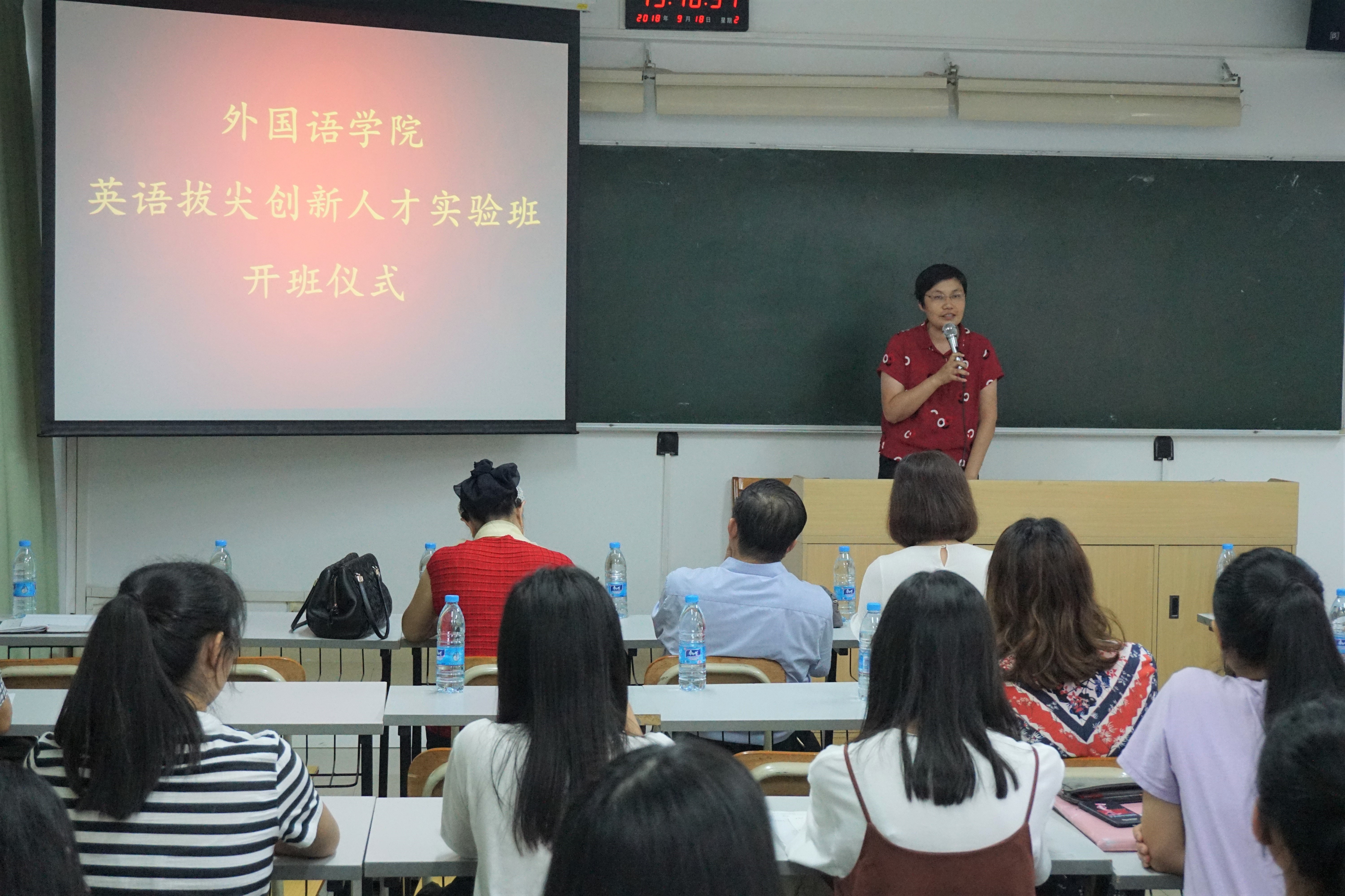 在文新楼315课室举行“英语拔尖创新人才实验班”开班仪式。肖坤学院长、苏远连副院长、蒋晓萍副院长、鄢智青副书记、实验班导师及同学出席了开班仪式。