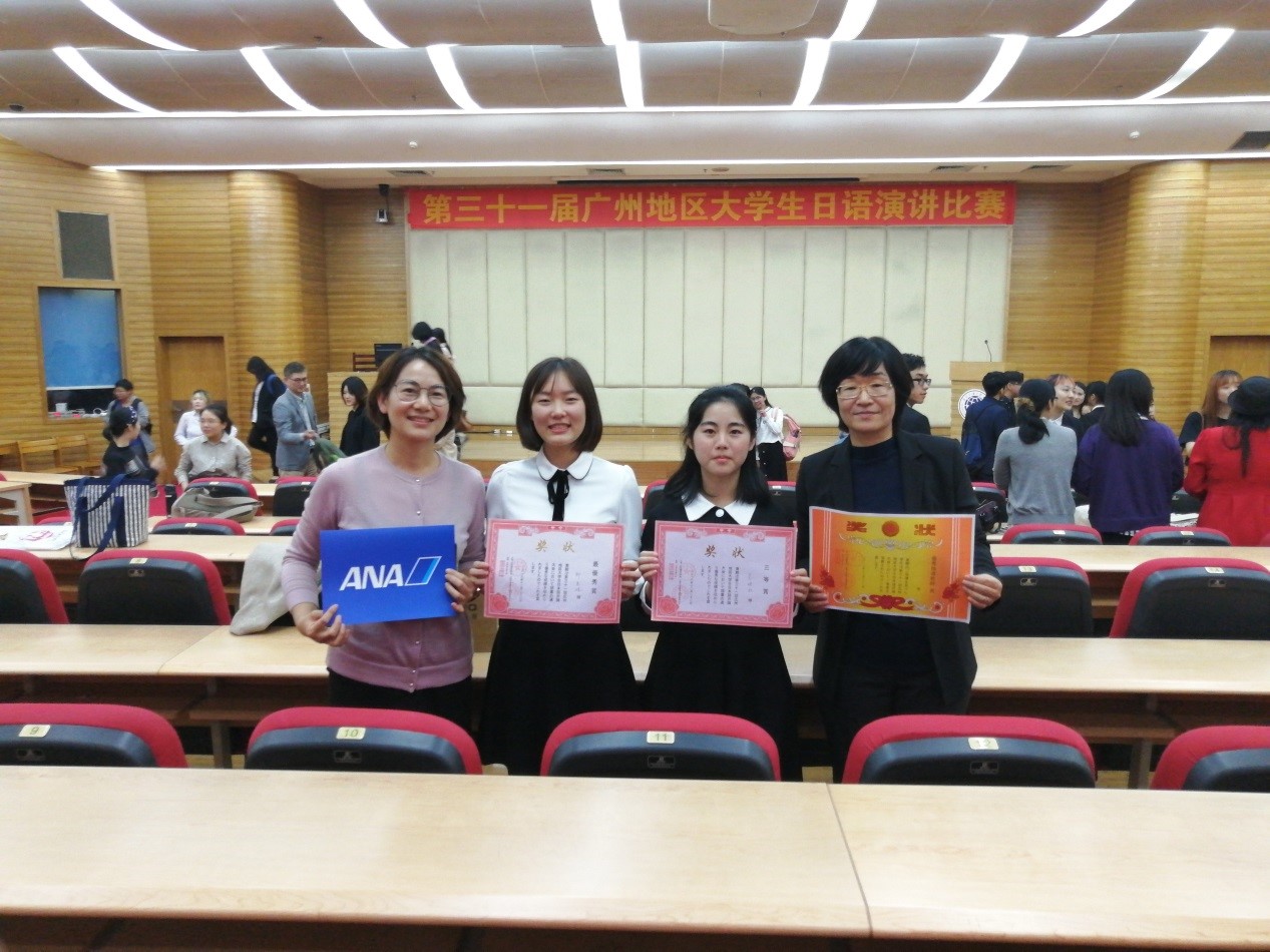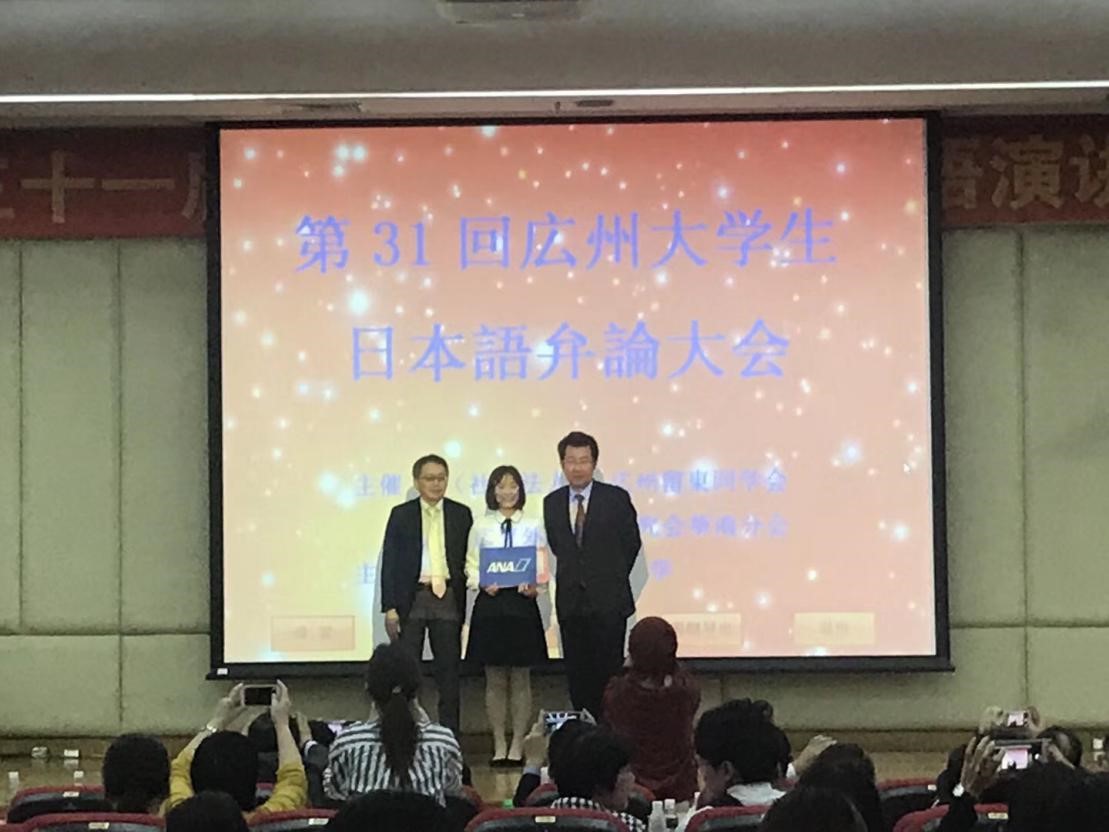 在来自中山大学、广东外语外贸大学、暨南大学等10所公立大学的23位参赛选手中,经过激烈的日语演讲角逐,我系日语171班郑吴姝同学以总分91.67高分排名第一,荣获特等奖。作为奖品,郑吴姝同学将获得由日本赞助商提供免费前往日本游学一周的学习机会。比赛中,郑吴姝同学以简洁大方的妆容出现在大家视线中,她以清晰流利的日语,抑扬顿挫的语音语调,为大家讲述了自身在异文化交流中频频出现的趣事。那丰富幽默的身体语言,也让观众和评委倍感有趣。在即兴环节中,对于评委的“食在广州”难题,她从容自信,有条有理的向大家介绍广州的早茶文化。最终在评委的一致认同中,取得最优异的成绩。