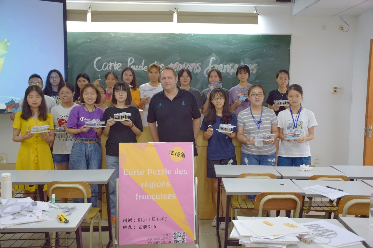 6月11日下午,色漫网 西语系本学期第三次法语角活动在文新315如期举行。活动在外籍教师Sébastien Damry的耐心指导下顺利展开,法语专业同学积极参与,学习热情高涨。借助拼图等一系列有趣的活动,在轻松愉快的氛围中Sébastien Damry老师带领同学们了解法国的一些政区知识和美食文化。此次活动寓教于乐,不仅使同学们增进了对法国文化的了解,并且进一步培养了同学们法语学习的兴趣。