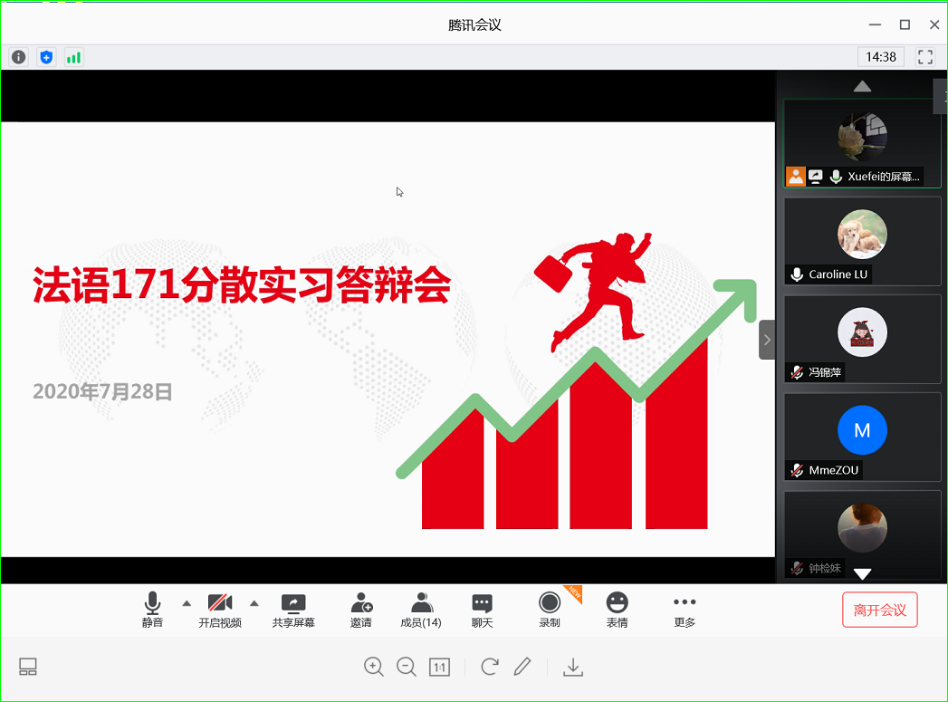 2020年7月28日20:00,法语专业借助腾讯会议平台组织了171班线上分散实习答辩会,系主任邹琰副教授、系副主任陈潇老师,专职教师冯雪飞老师、李悦老师和卢秋燕老师担任答辩评委。9位同学就实习目的、企业介绍、实习内容、实习评价、实习收获等方面进行了汇报,并就评委老师提出的问题给出了满意的回答。